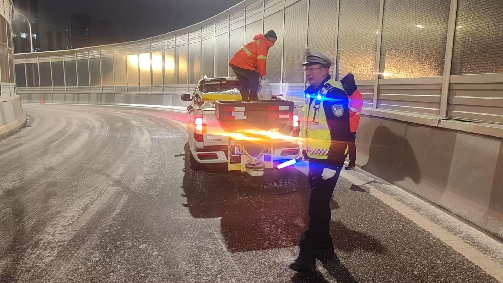 20日清晨,气温较低、路面湿滑给交通出行带来安全隐患,全市交警辅警提前上岗,做好路面管控和车辆疏导。主动与城管、环卫、市政等相关部门联系沟通,共同做好抛洒融雪剂、铲冰除雪、道路清障等工作,保障早高峰通行安全。
