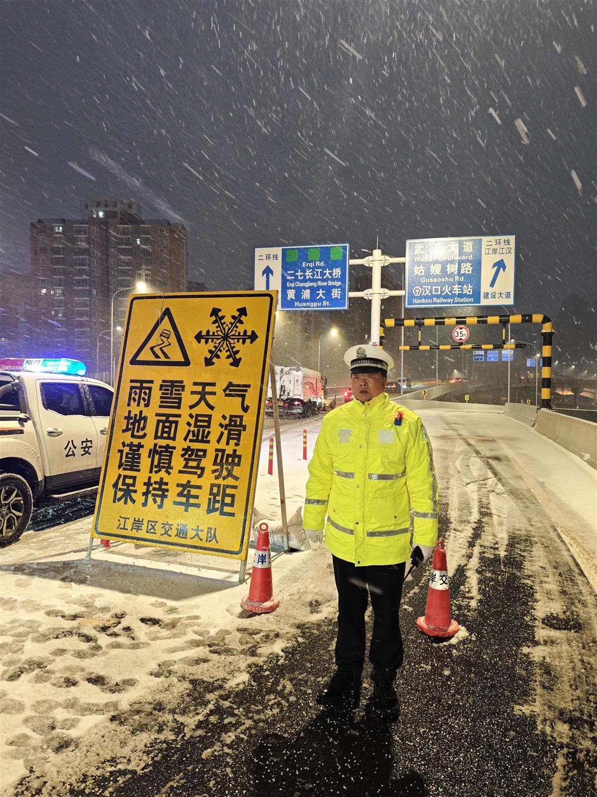20日零时左右,武汉开始降雪,连接月湖桥的宝丰高架桥上风大气温低,部分路面结冰。硚口分局交通管理大队二中队中队长唐加印,带领同事彻夜巡逻,配合城管融冰除雪,指挥车辆顺利通过。一辆大货车因路线不熟,误上高架桥,唐加印耐心给司机师傅指路,引导他安全到达平面层。