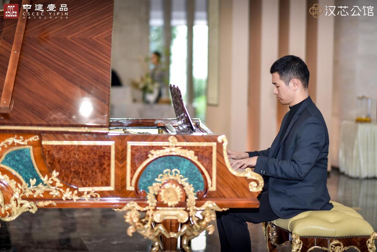 伴着小提琴的音乐声,踏着舞者的步履,嘉宾和挚友们抵达城市美学馆内。钢琴家郭晓宇在奥本海默的家传施坦威钢琴上弹奏一曲风华绝代的【芯生·绽放】,随着一个个美妙的音符,在指缝中穿越鎏金岁月,抵达众人耳畔,舞者缓缓踱步,让肖邦《升C小调幻想即兴曲》在中建壹品·汉芯公馆再度焕发“芯”声。百年前的乐章,再次发声;百年前的经典,再次邂逅,共见伟大“芯”生!