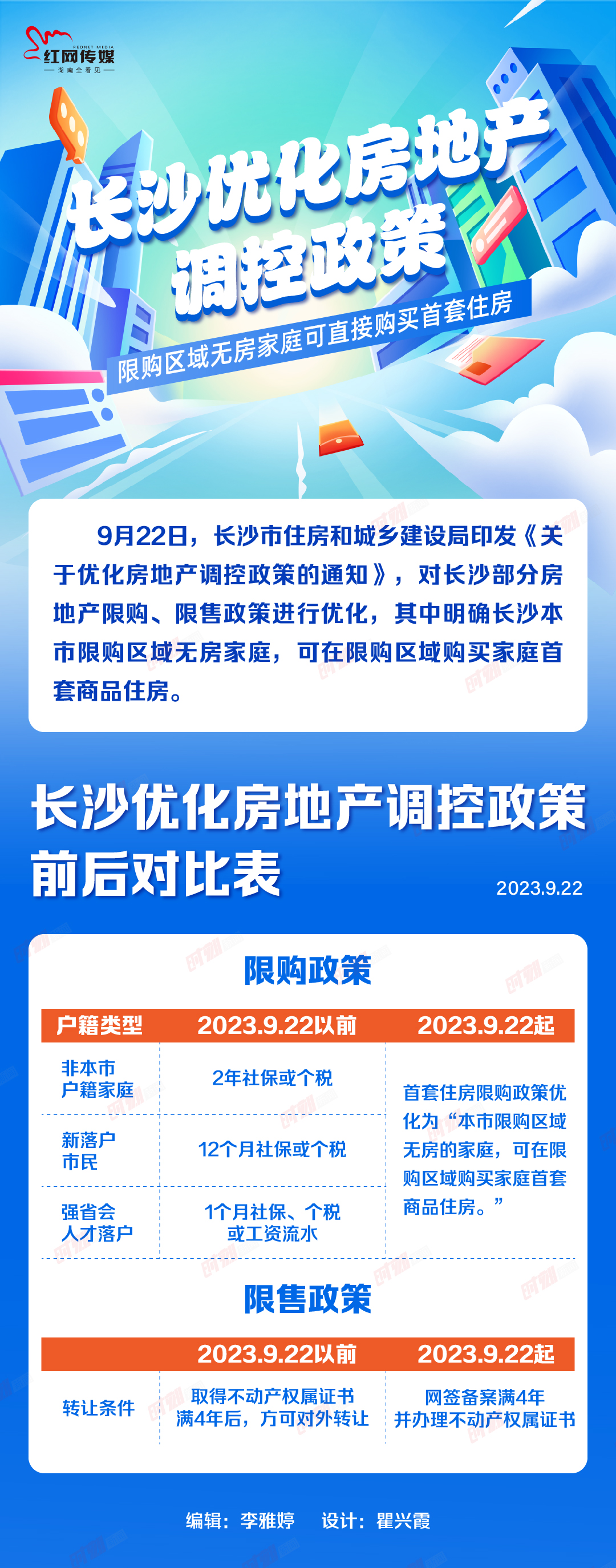 红网时刻新闻9月22日讯(记者岳瑾)9月22日,长沙市住房和城乡建设局印发《关于优化房地产调控政策的通知》,对长沙部分房地产限购、限售政策进行优化,其中明确,居民家庭(含非本市户籍家庭)在长沙购买首套商品住房,不再需要提供购房证明;商品住房网签备案满4年,可进行转让。市住建局相关负责人表示,此次政策优化旨在坚持因城施策、精准调控的要求,更好满足刚性和改善性住房需求,促进房地产市场平稳健康发展。通知自9月22日起施行,有效期5年。