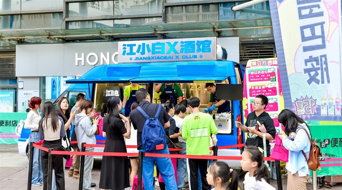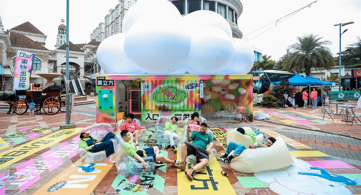9月23日,繁华似锦、各国风情汇聚的武汉光谷步行街头,大量年轻人在意大利风情街驻足停留:在具有强烈色彩冲突的涂鸦活动现场,头戴云朵头套、七彩多巴胺穿搭的行为“艺术家”,不断热情邀约过往行人在云彩底座休息、饮酒;大量从city walk 显眼包“引荐”而来武汉大学生,用畅饮卡换取了果立方shot跳跳杯、预调酒等畅快酒水,并凭借兑换卡换取云朵便利店琳琅满目零食,喜笑颜开。