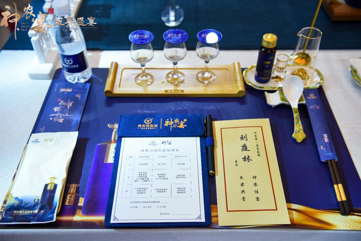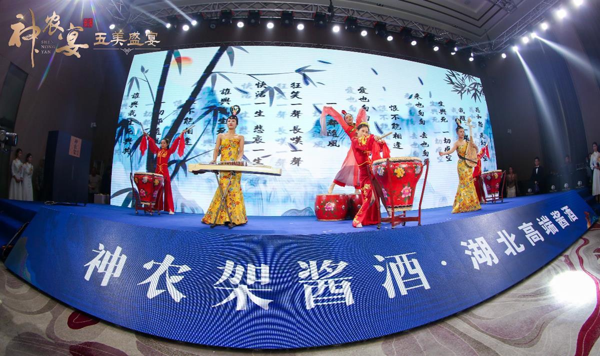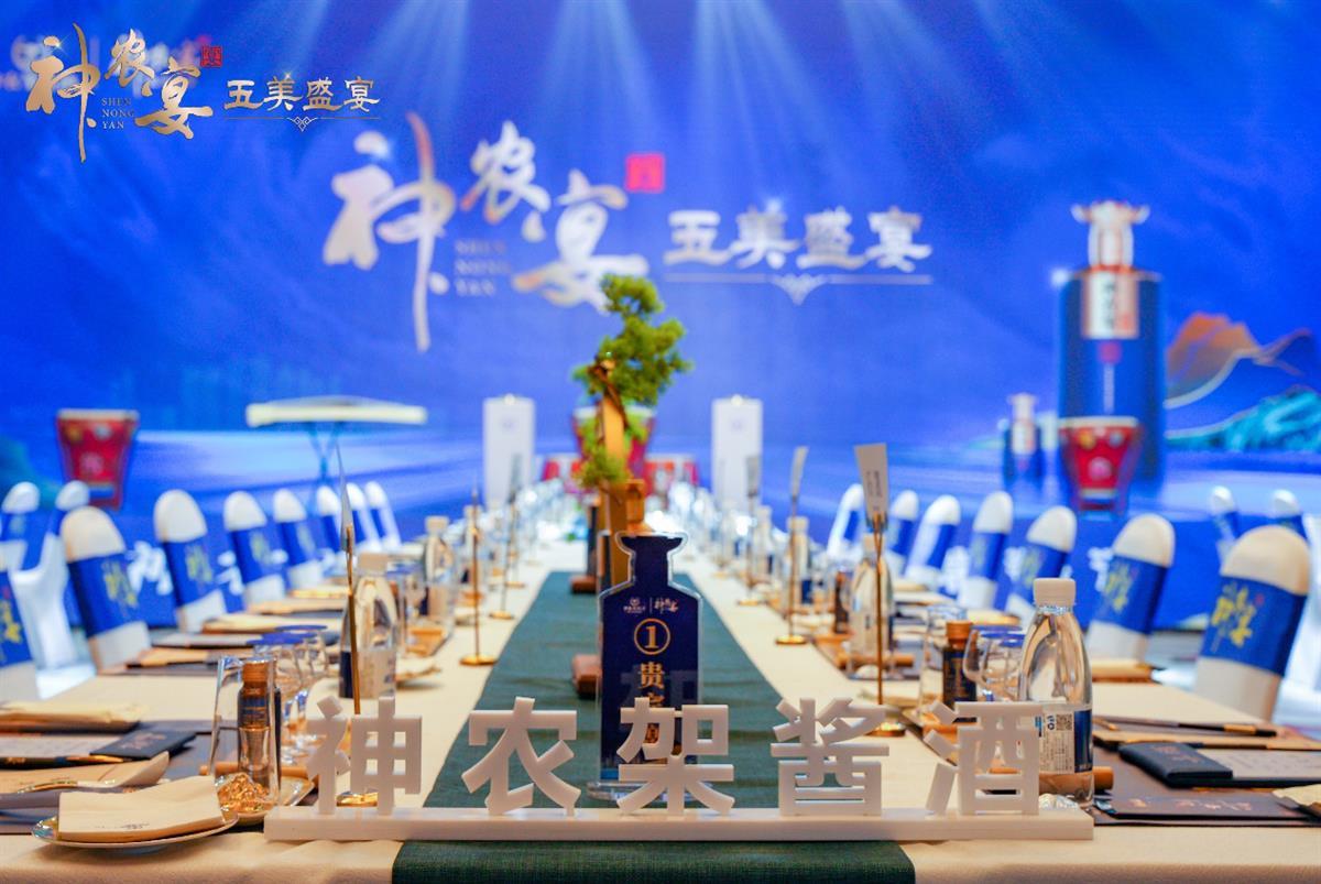 晚宴现场延续一以贯之的深邃星空蓝主色调大气布置,致敬神农酒祖文化,模拟还原神农架“暖湿、清风、富氧”独特产区气候环境,并设置神农架酱酒产品展示区、封藏酒展示区、DIY调酒品鉴区,“12987”传统酿造工艺展示区等,整体氛围打造高端奢华,环境静谧私享,以匠心致初心,将生态珍馐之味献呈给各位尊贵来宾,一席珍馐宴宾客,一杯美酒敬神农。融入神农架特色梆鼓舞、十堰特色歌舞等,给到场嘉宾以绝佳尊贵感受及奢华体验,可现场全方位了解神农架酱酒的历史、工艺、品质与文化。