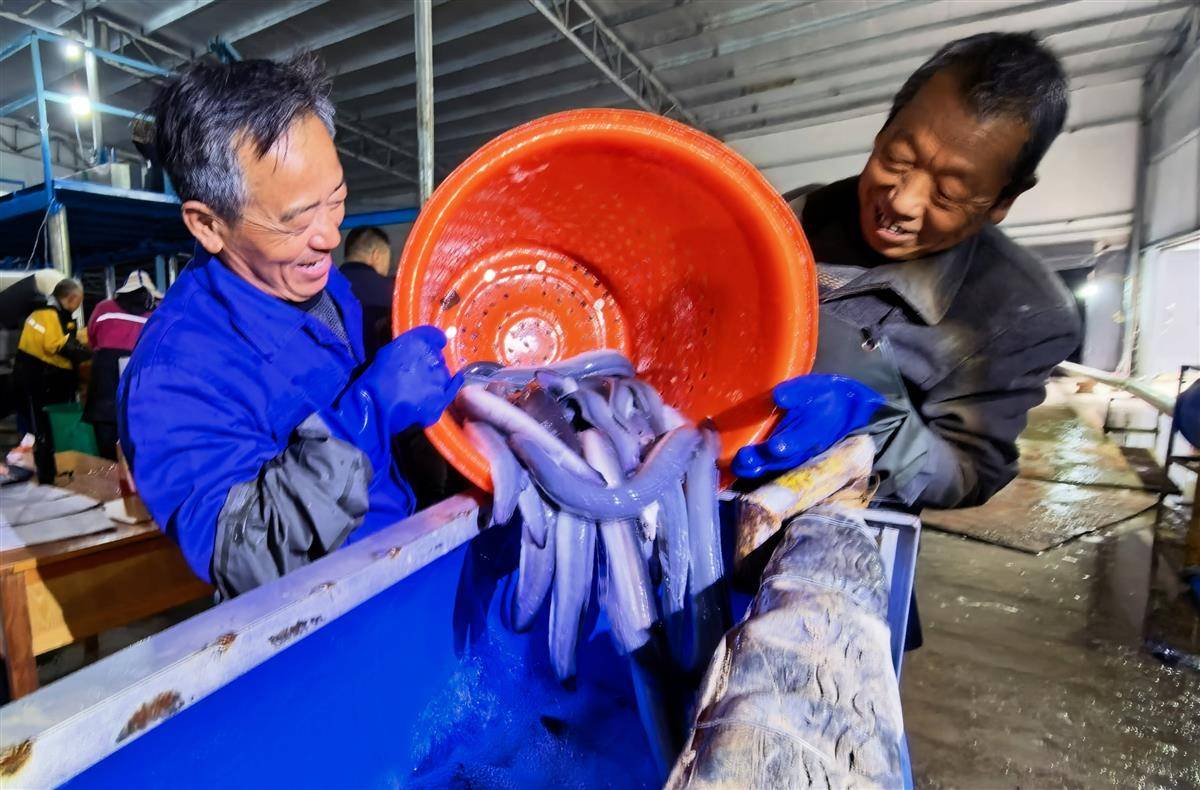 12月4日,远安县旧县镇龙泉村的鳗鱼养殖基地里,工人正在分拣鳗鱼。 (湖北日报通讯员 温宜飞 摄)