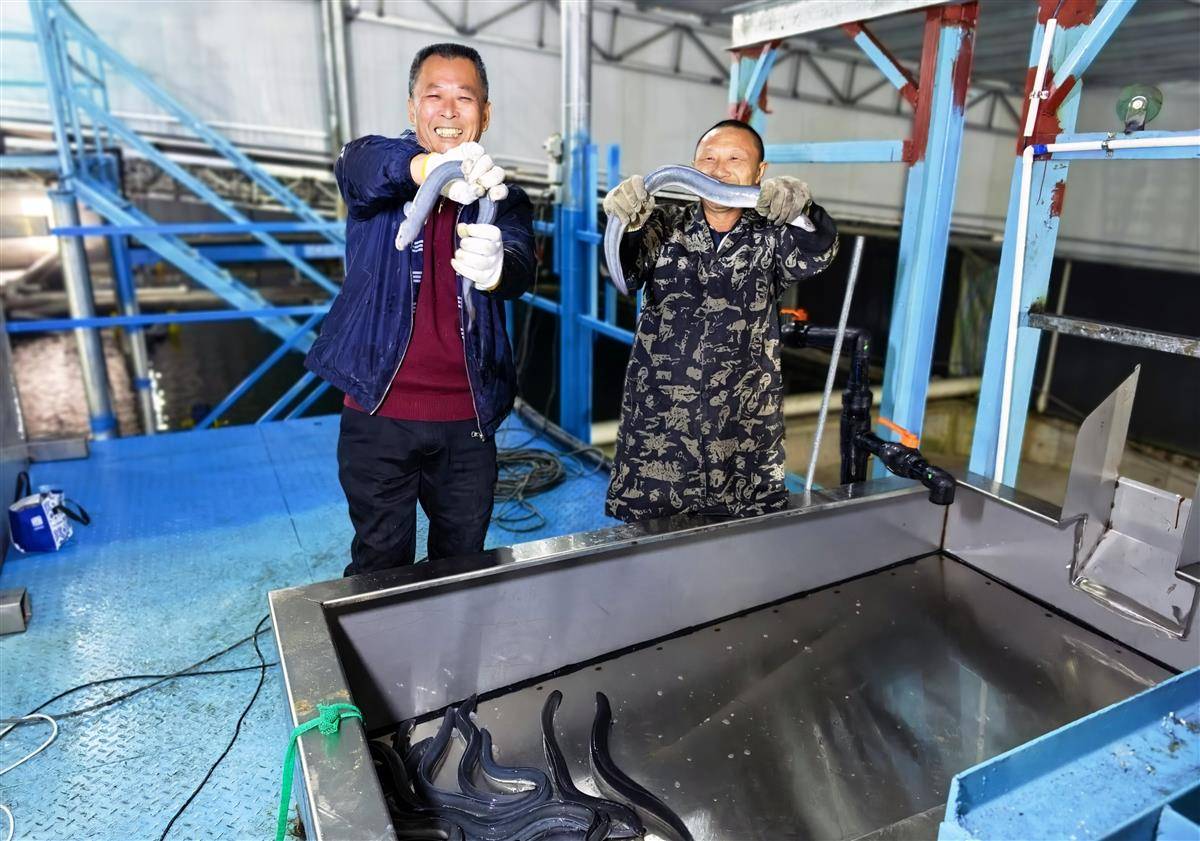 2024年3月,养殖基地签约开工建设,建成养殖池86口,同年12月27日投放了500万尾南美洲鳗苗。与热闹的分拣鳗鱼处仅一墙之隔,昏暗的养殖车间里气温明显高了不少,透过手电筒的灯光,可见密密麻麻的鳗鱼正在水中游动。