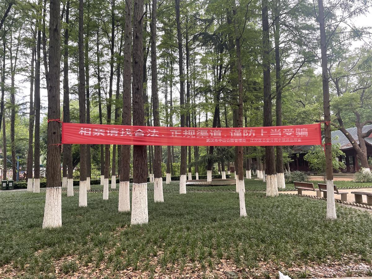 记者在中山公园相亲角看到,这里已经被围挡圈起来在进行绿化工程改造,旁边的树上还挂着“相亲请找合法、正规渠道,防止上当受骗”的红色条幅。但是曾经在这里促成过一段婚姻的姚爹爹,还是选择再次来到这里。