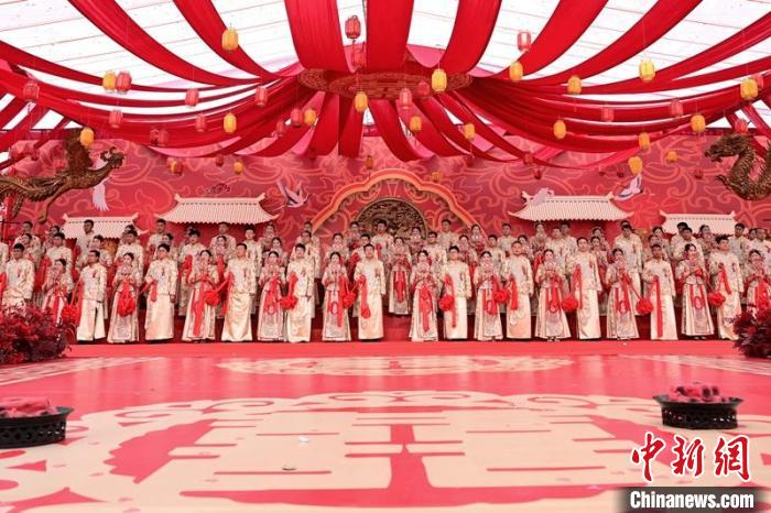 集体婚礼现场,父母亲友、领导同事共同见证和祝福声中,身着中式盛装的新人从幸福大道缓缓步入婚礼现场,通过鹊桥、跨马鞍、迈火盆、行拜礼、合卺礼、执手盟誓等仪式,新人们共同许下了爱的誓言,携手步入婚姻殿堂。新人亲朋、企业员工以及社会各界朋友近万人通过线上线下同步观看,感受喜庆氛围,分享新人们的喜悦,共同见证并送上祝福。