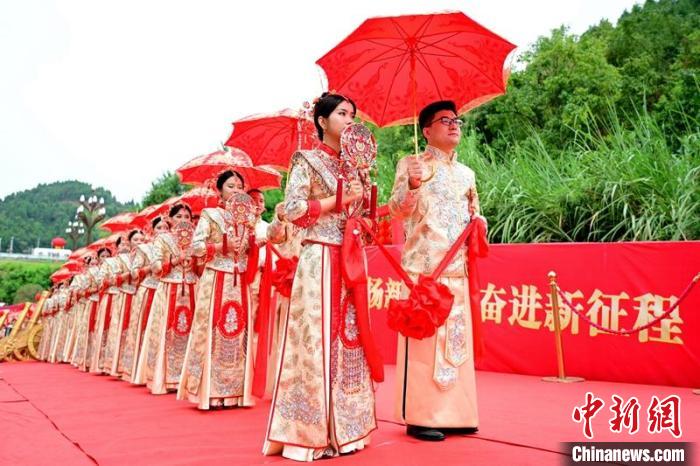 中新网成都9月19日电(记者刘忠俊)9月19日,四川成都经达州至重庆万州高速铁路(下称:“成达万高铁”)工程南充蓬安县境内的燕山寨隧道口,一场热闹的工地集体婚礼正式上演,38对来自铁路建设一线的情侣牵手走进婚姻殿堂,喜结连理。
