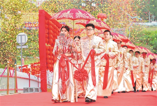 当日,在成达万(成都经达州至万州)高速铁路四川省蓬安县燕山寨隧道口的施工工地,来自中铁三局五公司各建设工地的38对新人,身着中国传统婚礼服饰参加集体婚礼。