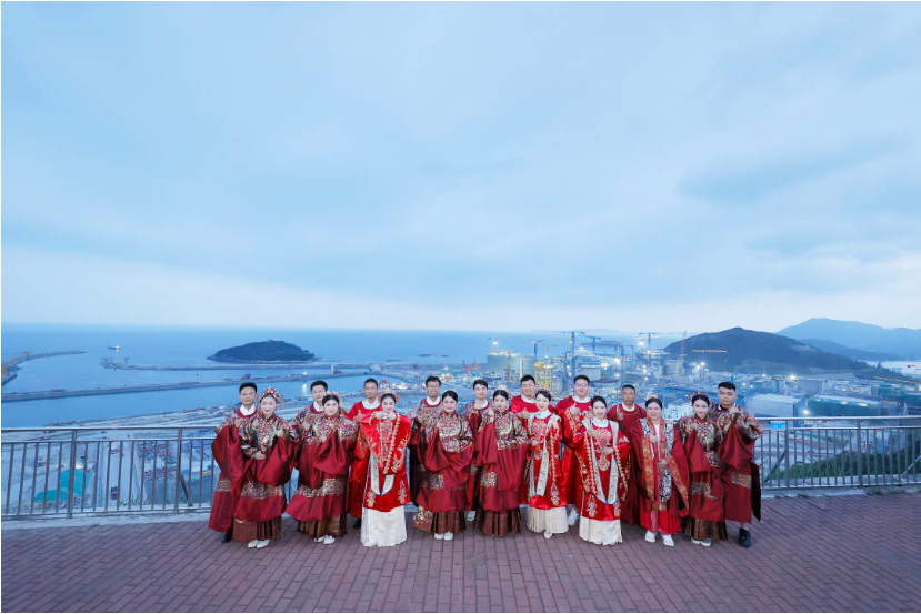 仪式后新人们前往中建电力承建的我国首个生态核电示范项目——广东太平岭核电项目拍摄工地婚纱照。(主办方供图)