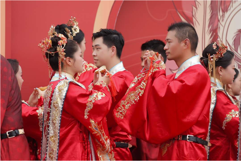 当天,30对新人一同来到集体婚礼现场。却扇礼、沃盥礼、合卺礼,一个个颇具仪式感的环节之后,新人们解缨结发,交换信物,执手诰天。光明区民政局党开颖主任为现场新人证婚并送上祝福。礼成后,观礼的亲朋们挥动喜扇,欢呼喝彩,为新人们送上热烈的祝福。