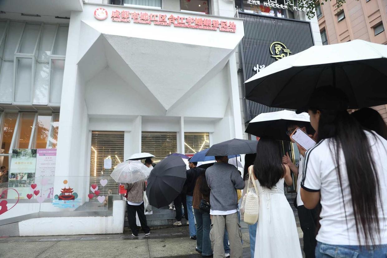 “最早的是6:00就过来排队了,我们8:50开始排号、取号、受理。这次国庆假期我们提前做了部署和安排延时服务为这些新人们办理婚姻登记。”锦江区合江亭婚姻登记处负责人曹彪补充道,“截至14:20,已办58对,全天预约新人达到80对。”
