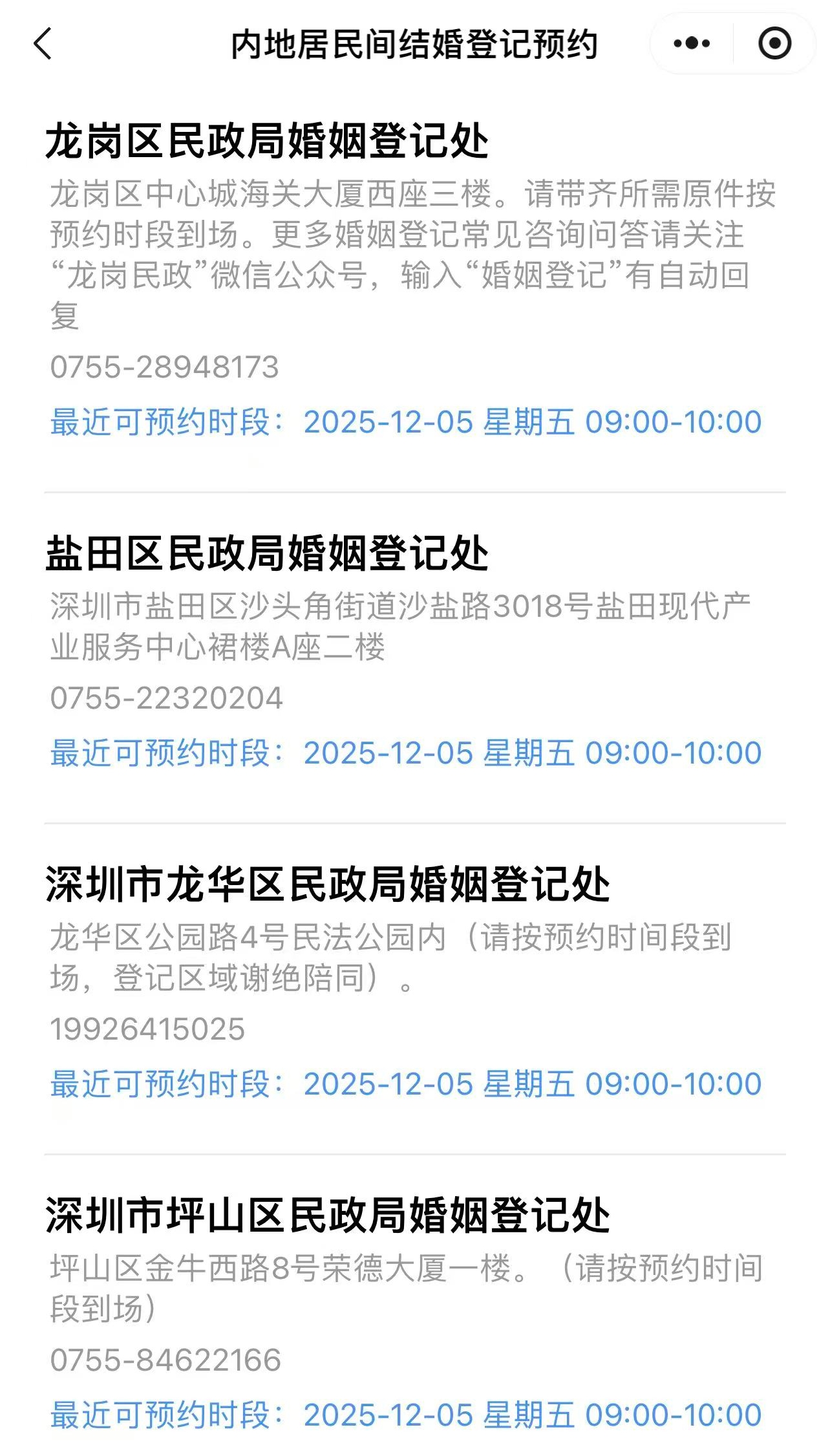 12月4日,广东省婚姻登记预约系统显示,深圳结婚登记的最近可预约时间为12月5日。