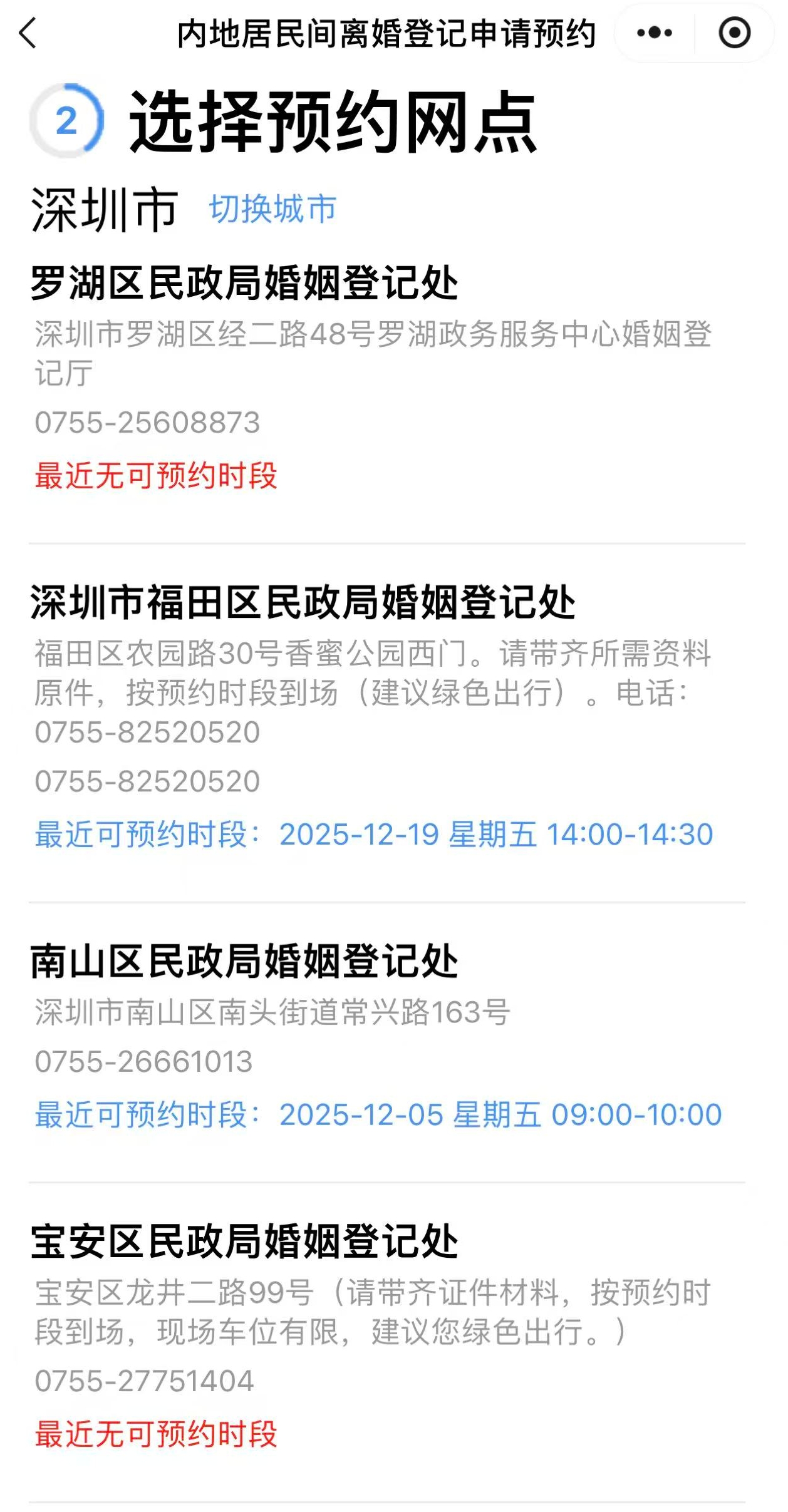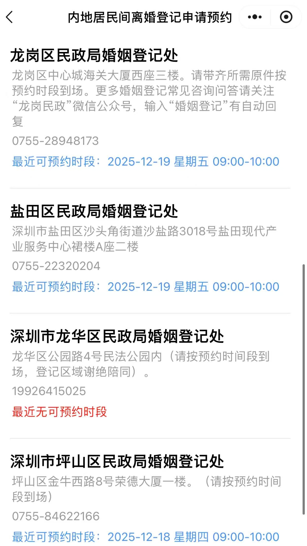 深圳新闻网2025年12月4日讯(记者 林玟珊 张玲)年底,在深圳进行婚姻登记的新人多了起来,不少网友担心抢不到号。12月4日,记者在广东省婚姻登记预约系统小程序上实际操作后发现,不论是结婚还是离婚,深圳预约号都可安排。目前系统显示,12月5日至12月19日,深圳就有多区可预约婚姻登记。