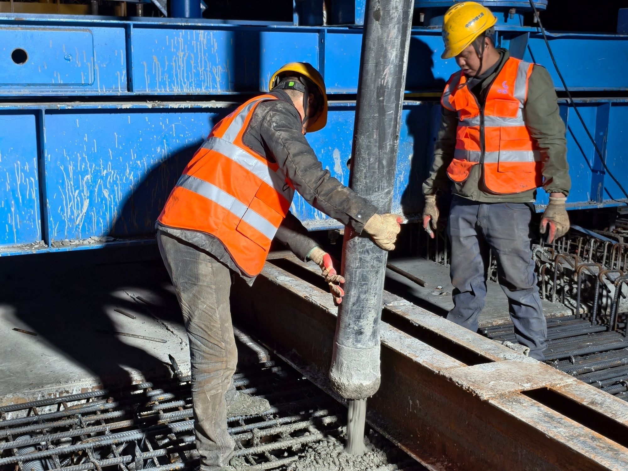 据介绍,面对风险和挑战,项目创新采用了集承重杆件、全自动液压模板、自动调节、自动走行、吊装、智能监测、全方位防护、自动喷淋、智能语音报警等九大智能系统的造桥机。它净重150吨,是下承式结构,与传统挂篮相比,重心降低了30% ,不仅降低了倾覆风险,还为钢筋安装提供了更宽阔的操作空间。同时,智能化的液压模板、自动调节、走行等系统,能精准控制模板的开合,让造桥机移动更便捷,单节段走行时间缩短90%,整体施工效率提升30%以上,人力投入减少40%,梁体施工精度控制在毫米级。在施工过程中,造桥机还能通过智能传感器实时采集温度、应力、沉降等数据,经后台系统分析后自动调整施工参数,有效应对复杂地质条件和恶劣天气影响,既确保了施工进度与质量,也大大降低了安全风险。