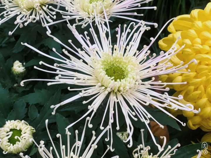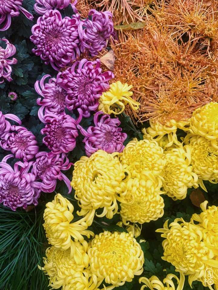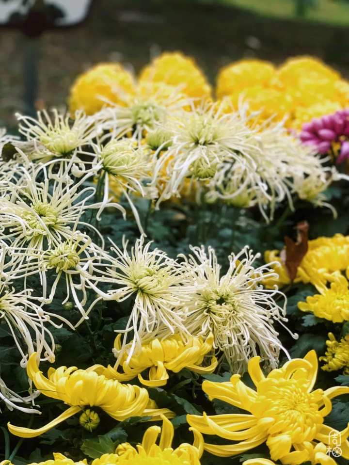 除了常见的蜂窝形、松针形的菊花,周小柚还在这里见到了荷花形、叠球形等诸多造型各异的菊花品种。此外,菊花色彩种类之丰富,也令人惊叹,感觉单单一种菊花便能有与春日百花争艳的实力。