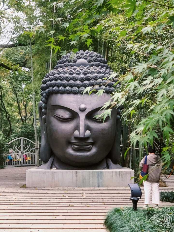 在逛菊花展的途中,周小柚还发现了植物园里一处小众打卡点——韩美林艺术馆。这个艺术馆的门头是一个巨大的佛头雕塑,掩藏在植物之间,神秘而肃穆。