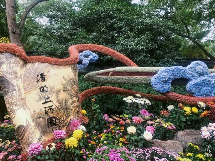 这次菊花展总共分为三大块展区来展示。菊花小品展区散落植物园南门、北门和玉泉景区整条路线上,共有12组以两宋风韵为主题的菊花小品。清明上河图、梦梁录等这些描绘宋代生活的作品,竟能通过菊花造景展现,周小柚也着实惊艳了一把。