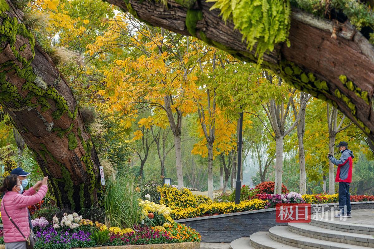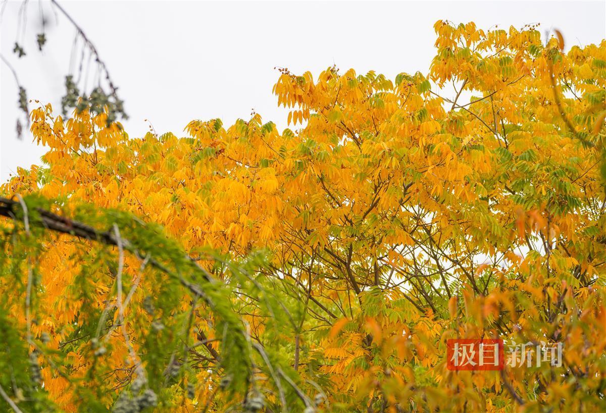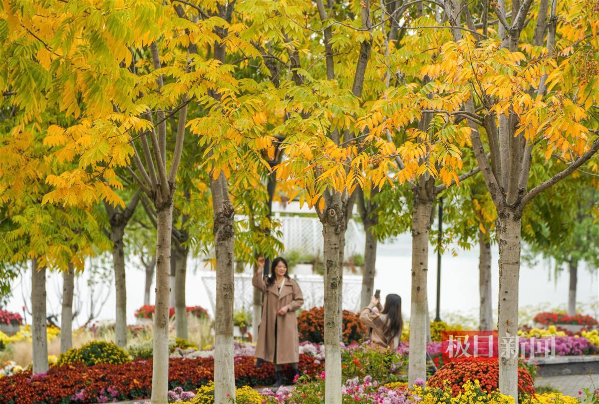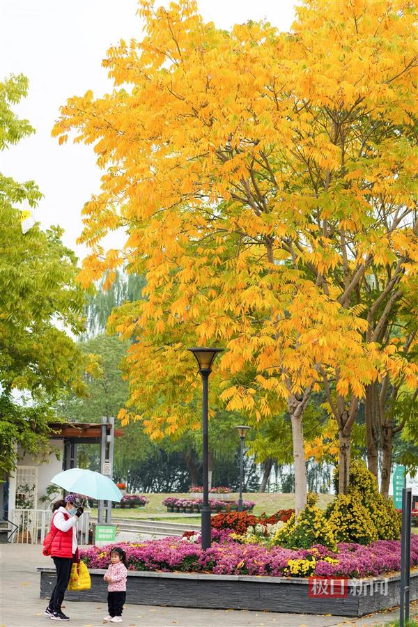 11月23日,记者在武昌沙湖公园C区看到,一片无患子树树叶已经变黄,金灿灿的叶子给该区域增添了一道靓丽的景色,不少在园内散步的市民纷纷前来打卡。