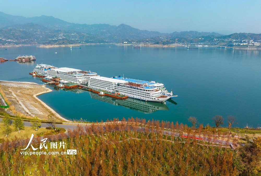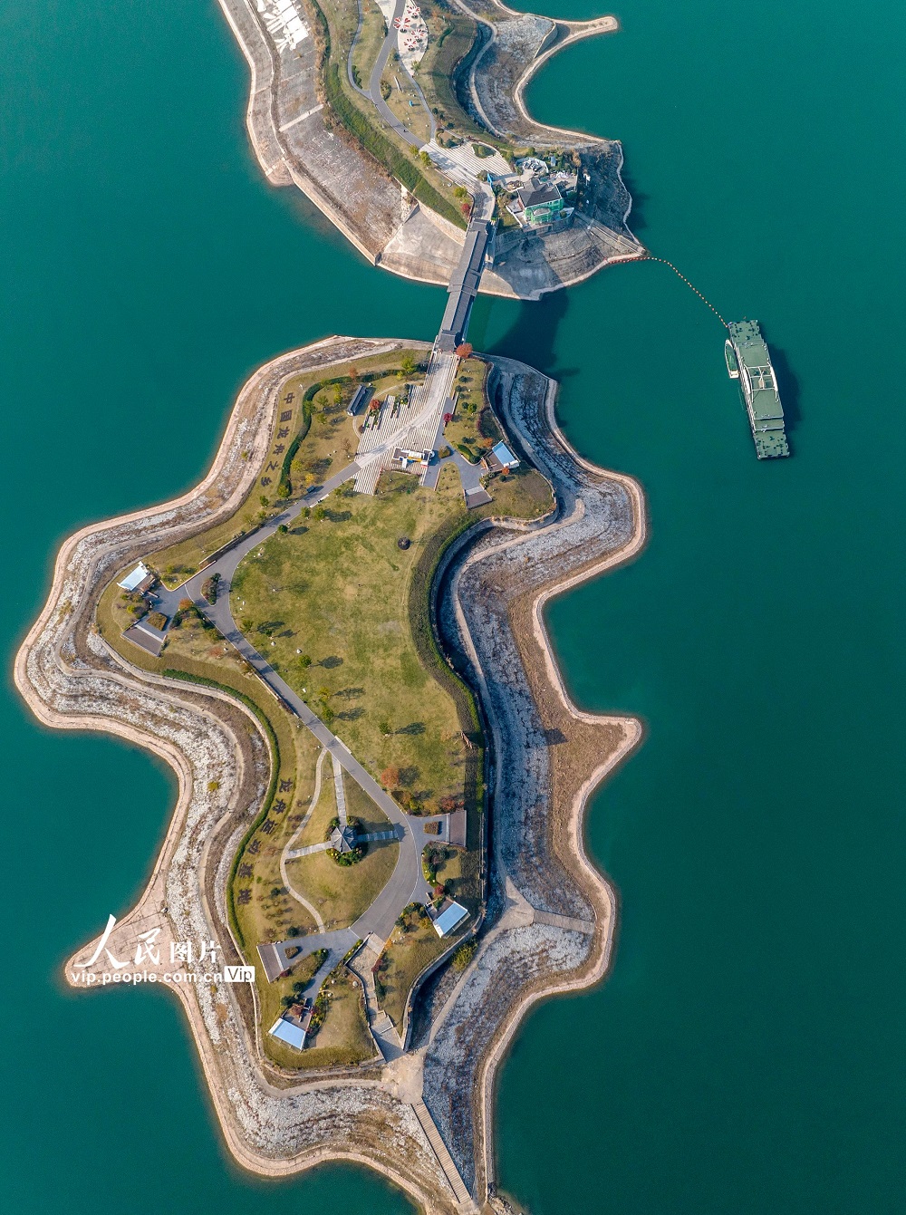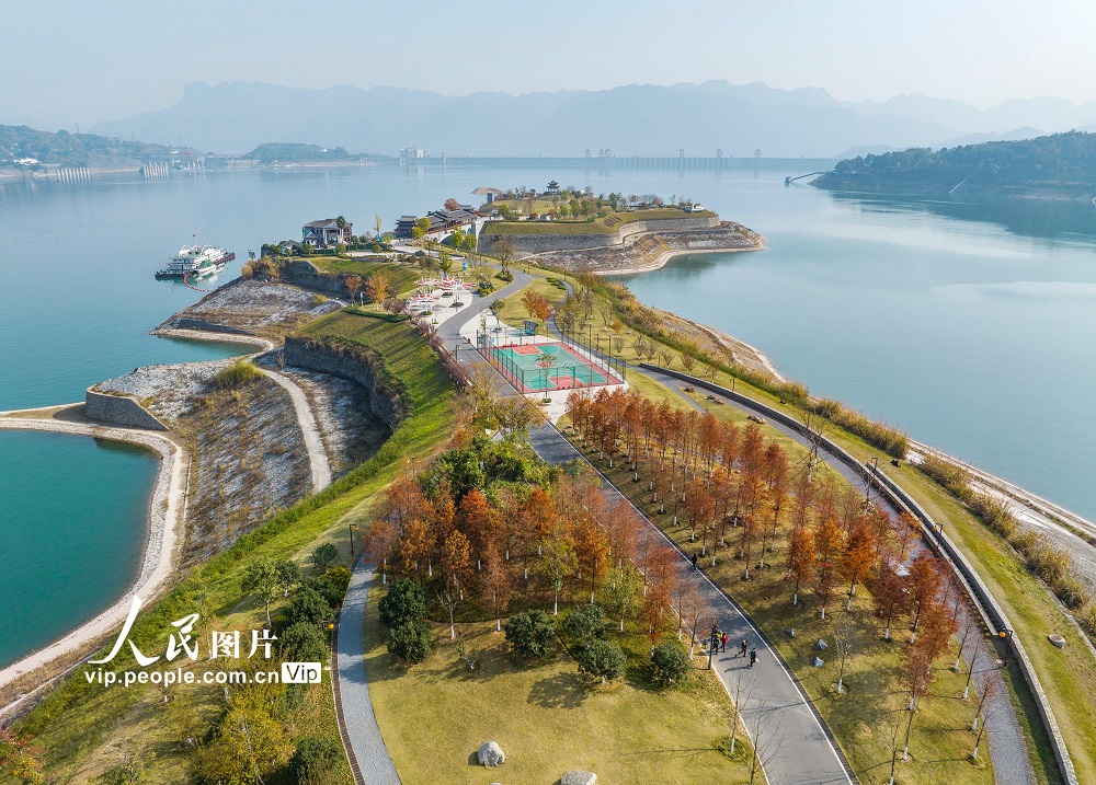 眼下,长江三峡两岸层林尽染、色彩斑斓,与蓝天、碧水构成一幅美丽的冬日生态画卷。近年来,紧邻三峡大坝的湖北省宜昌市秭归县全面修复三峡库区生态,采取库岸工程治理、岸线植绿复绿等措施,将昔日库岸线上的荒滩野岭建设成人们健身游乐的绿道、公园和景区,在三峡大坝前构筑起一道美丽的生态屏障。图为2022年12月14日,湖北省宜昌市秭归县木鱼岛公园风光。王罡摄(人民图片网)
