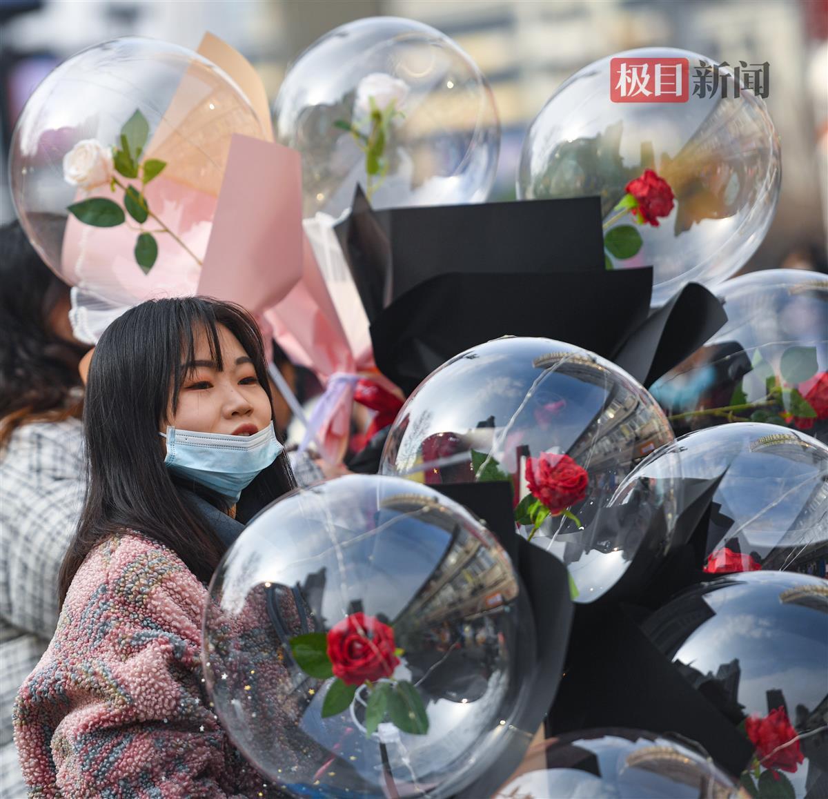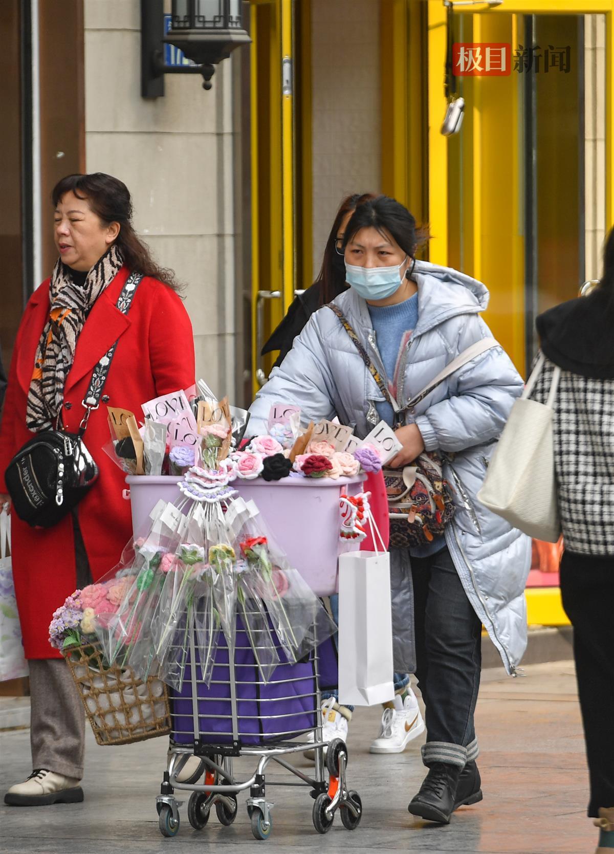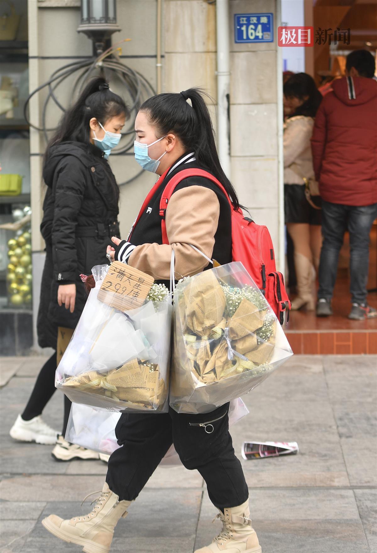 2月14日,武汉江汉路步行街处处都是卖花人。从地铁口出口,到街边的台阶,街道的人群中,卖花人或原地等待顾客,或推着花车,或抱着花束,或挎着塑料袋,花的品种以玫瑰花为主打,颜色各异。“一年就等这一天,但愿自己今天能够赚一笔。”贾女士告诉极目新闻记者。