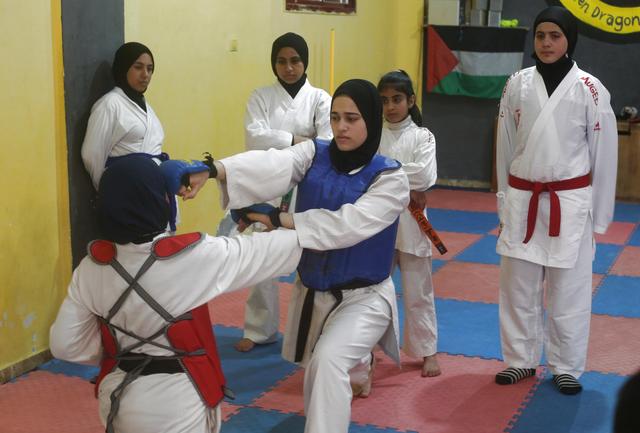 2月22日,女孩们在加沙地带拉法城的一家俱乐部上空手道课。