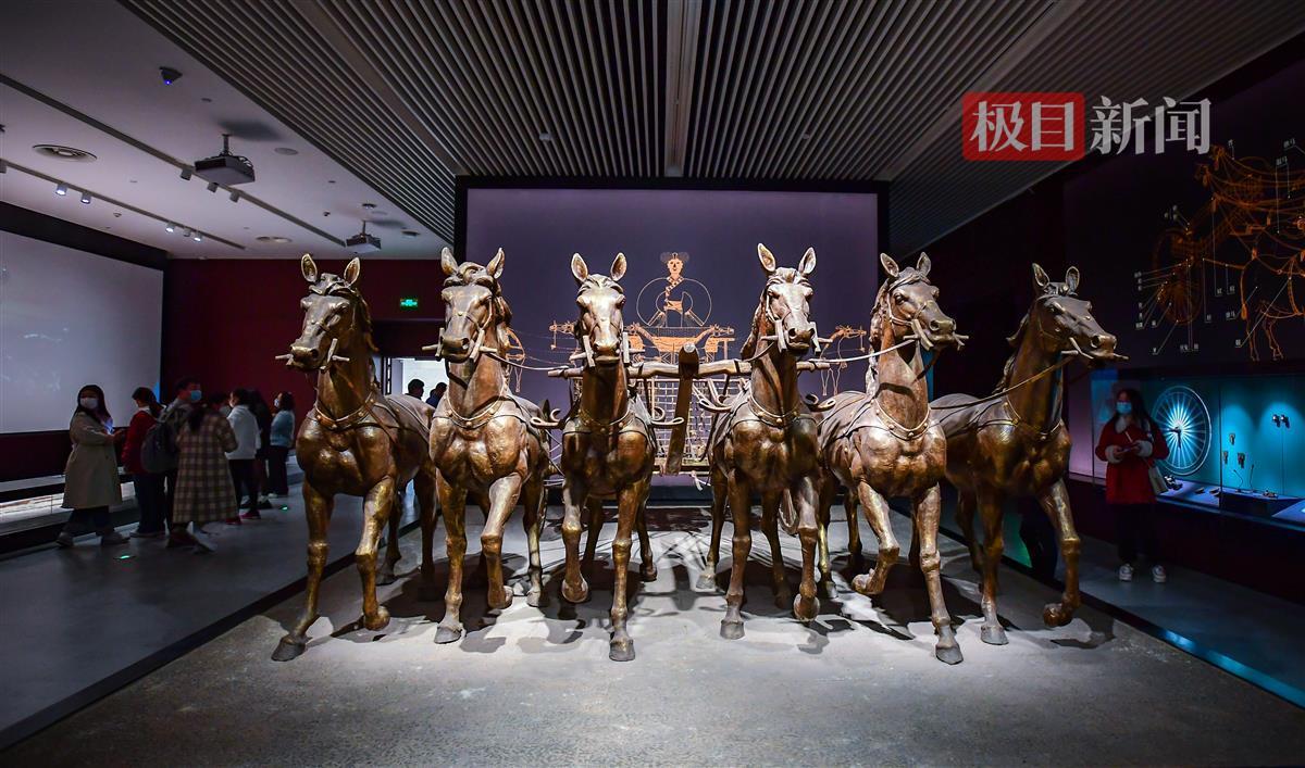 “这是根据荆州熊家冢遗址复原的雕塑,据推测是楚惠王时期。根据身份不同,驾马车分一驾、三驾、五驾,最高规格是六驾马车,只有君王可以乘坐。”现场工作人员介绍。