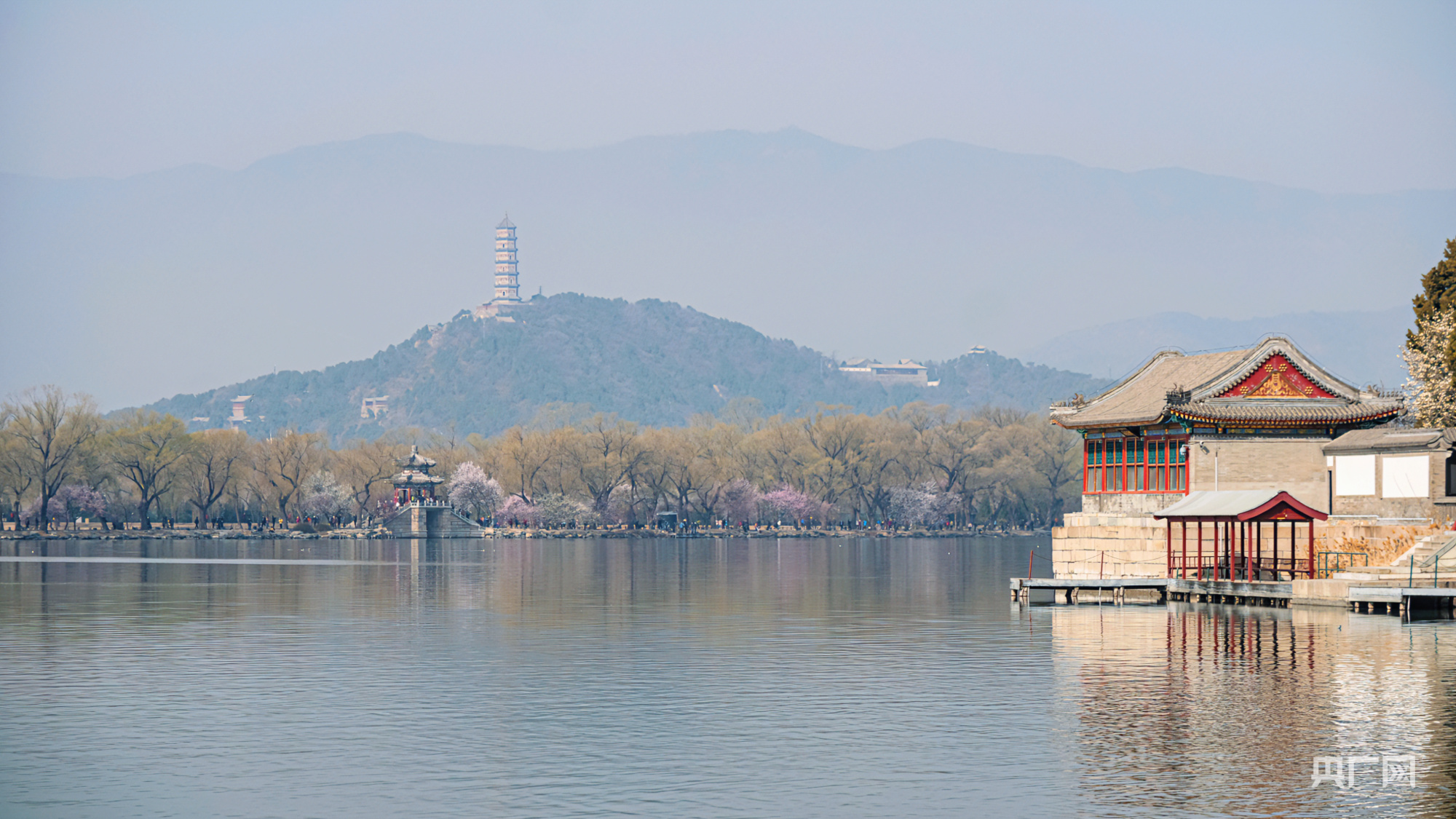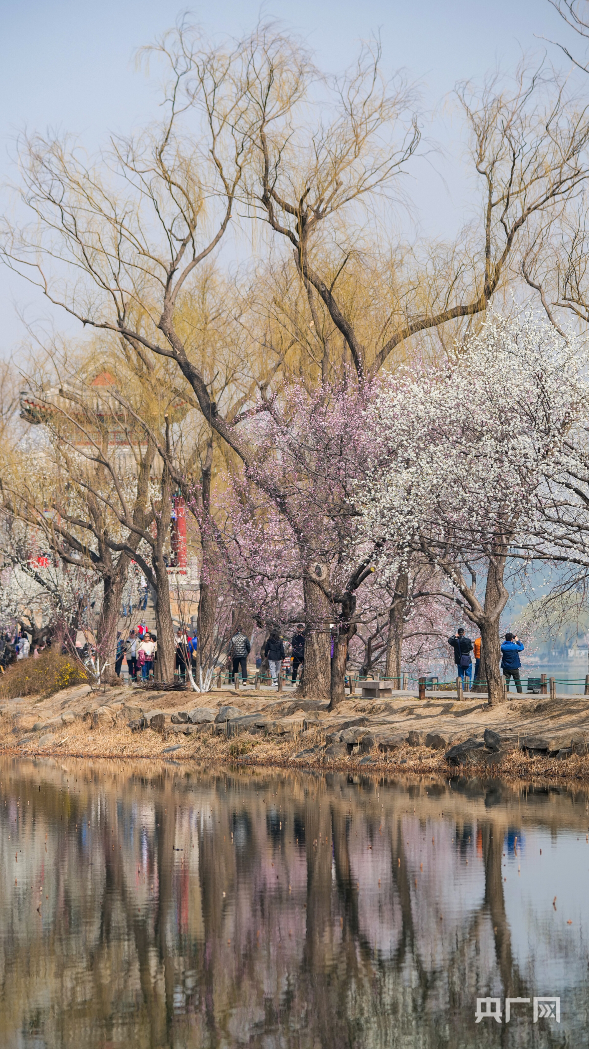 央广网北京3月11日消息(记者朱冠安)桃源只在西堤上,影落清波十里红。颐和园西堤的上百株山桃花进入盛花期,吸引众多市民游客前来赏花打卡。人在堤上走,宛若画中游。