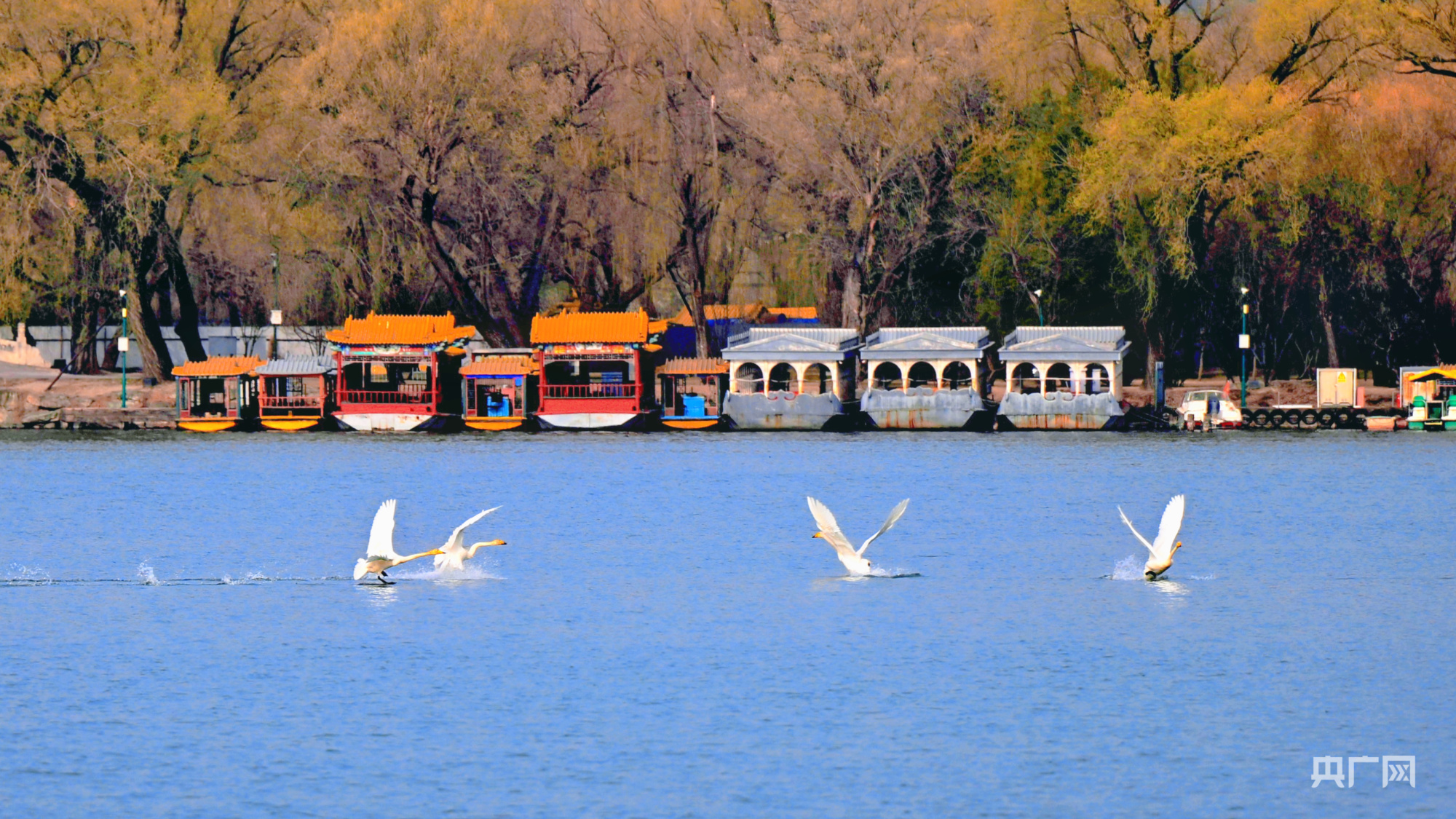 几只天鹅在昆明湖戏水(央广网记者朱冠安摄)