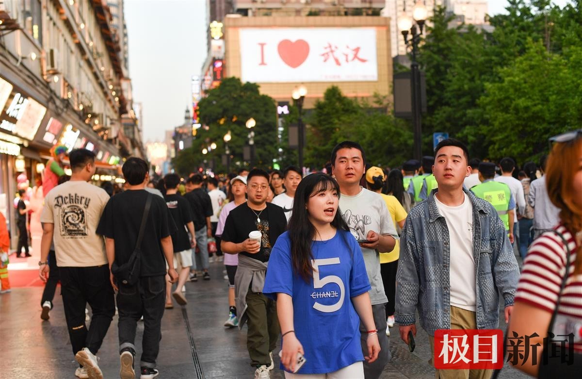 5月1日,游客在武汉江汉路以“我爱武汉”的广告牌为背景拍照,这块广告牌图文并茂、中英文结合,当游客走出循礼门地铁站J出口时,“我爱武汉”便会出映入眼帘。