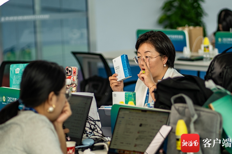 2023年中国(海南)国际热带农产品冬季交易会上,在媒体中心里,进行直播。记者刘孙谋摄