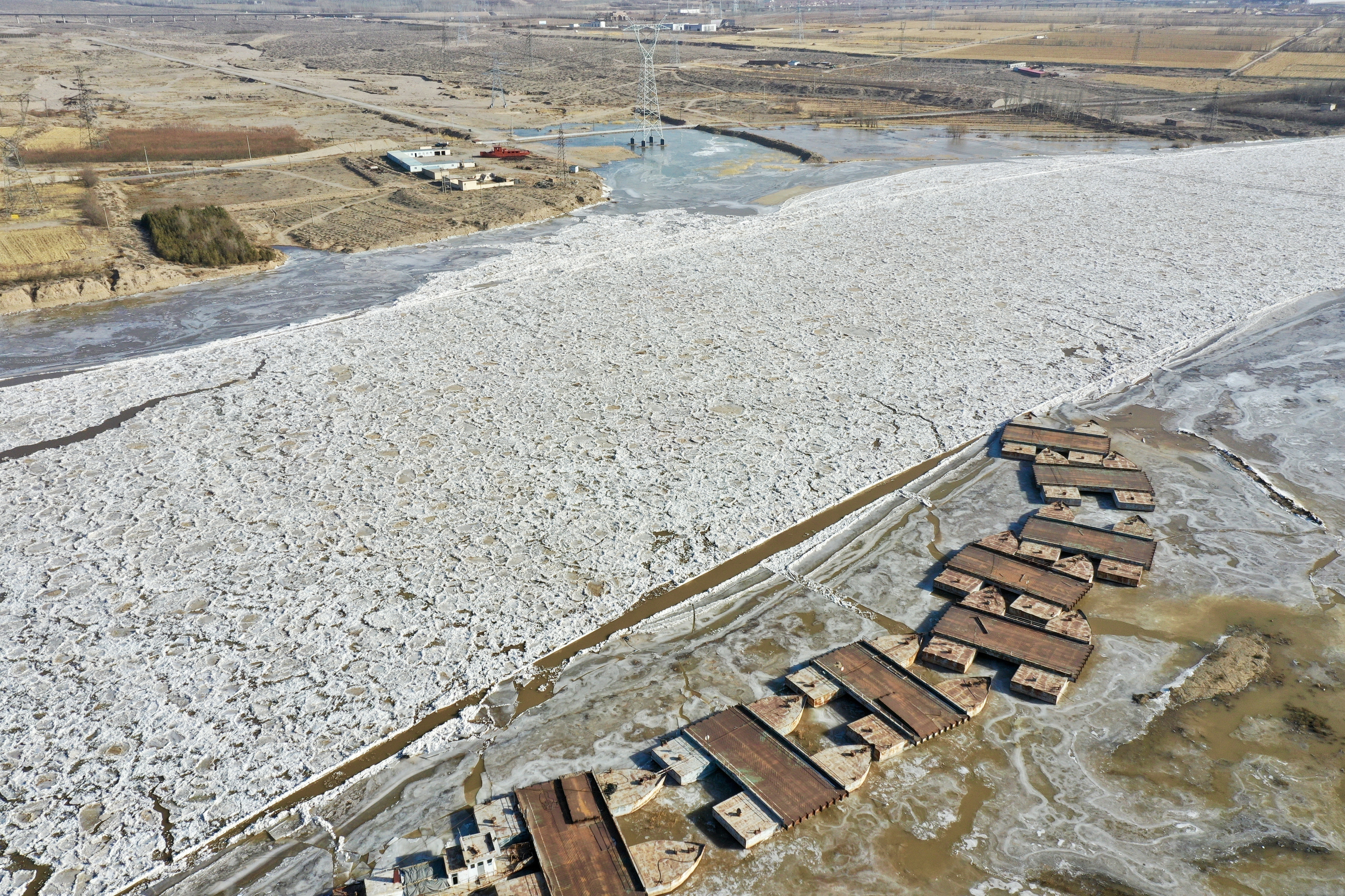 位于惠农区的麻黄沟黄河出境断面,是黄河在宁夏的最后一站。由于位置偏北,温度更低,大量凌流堆积在一起,形成壮观景象。每年凌汛期,黄河从下游的内蒙古开始,逐渐向上游宁夏开始封河,凌流不断堆积。