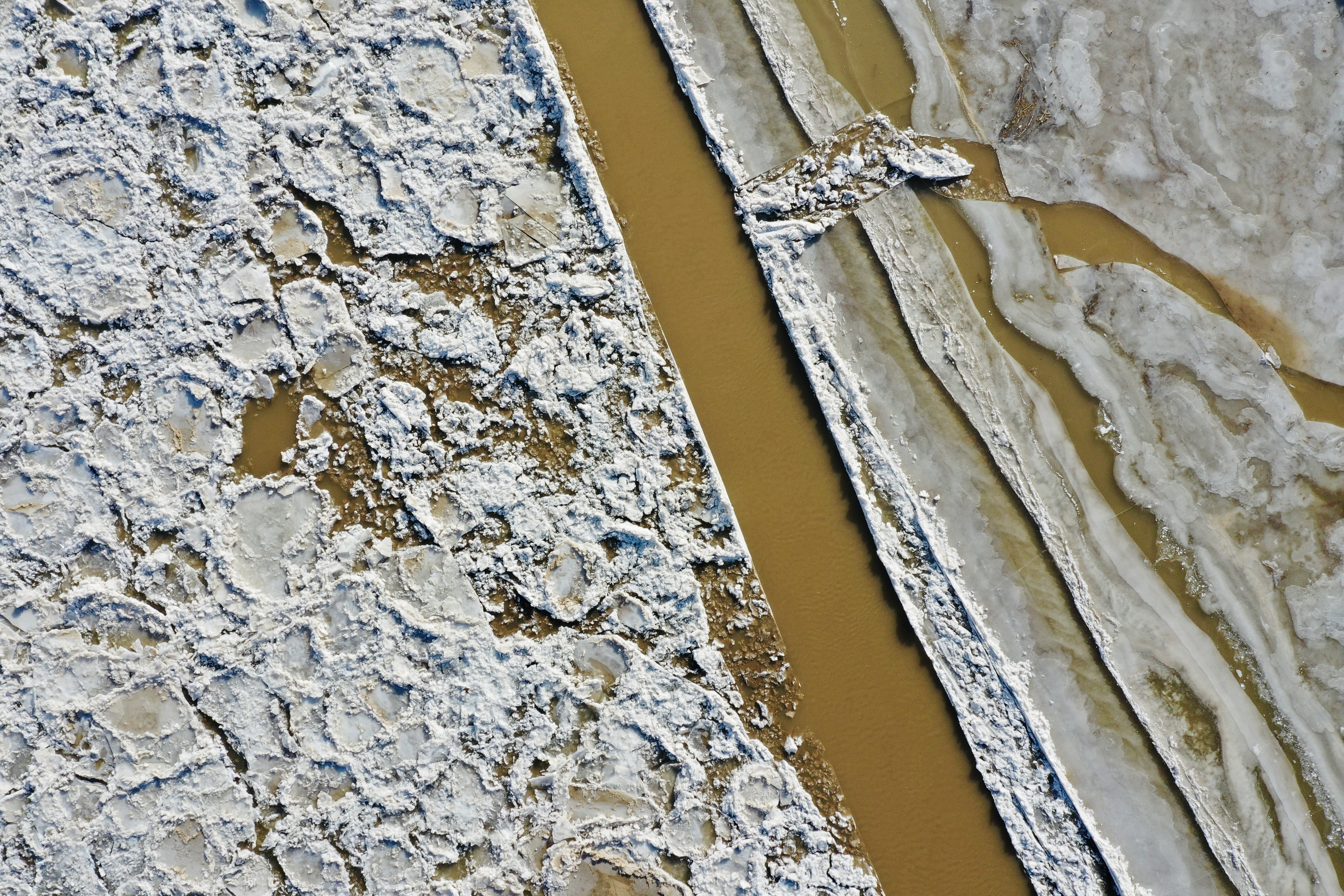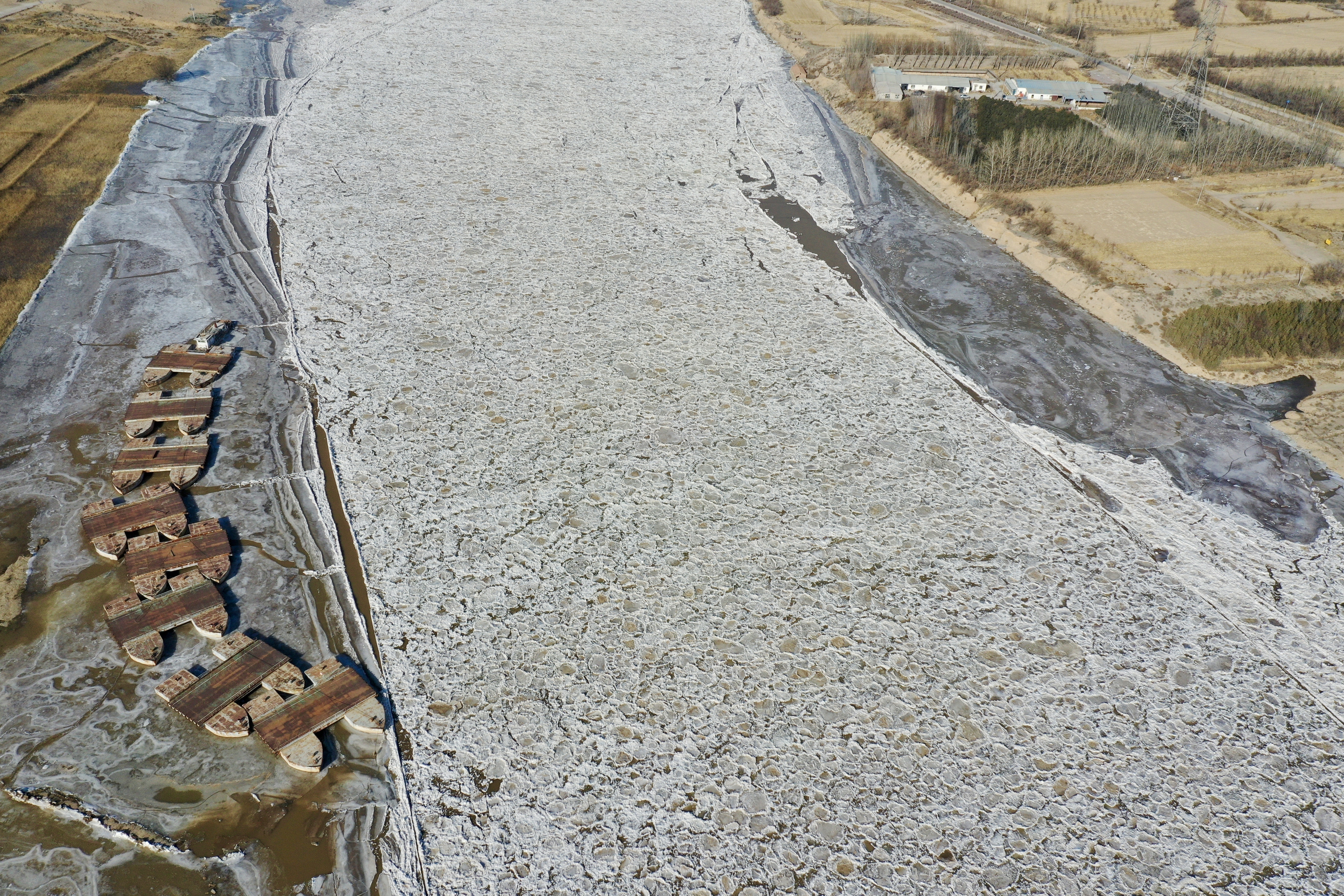 通过航拍可以看到,大量流凌密密麻麻堵塞河道,形成冰坝。在麻黄沟区域,每年凌汛会将黄河水位提升至少3米,河水外溢出河道,在岸边冻结形成了大片冰面。