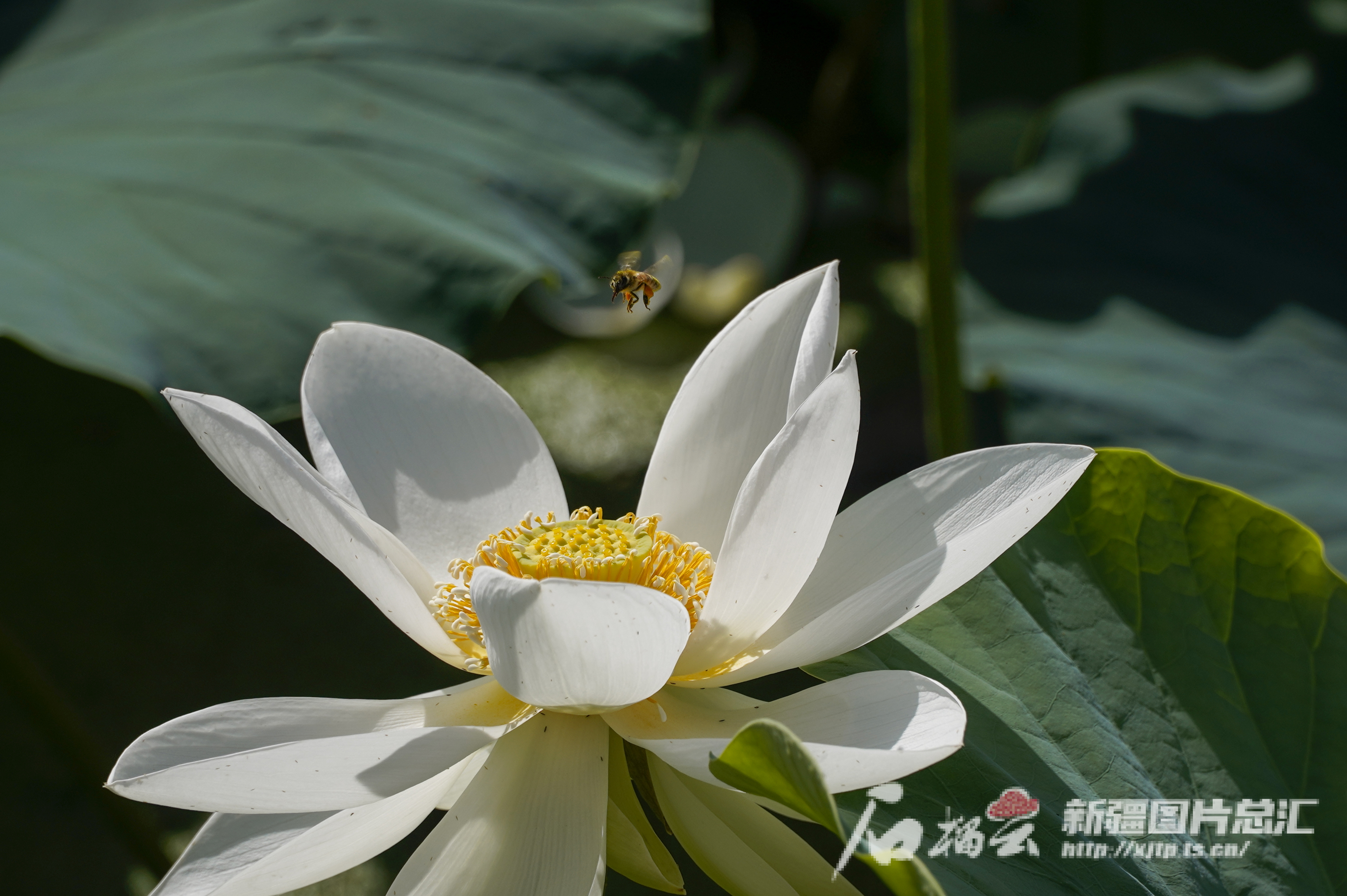 一只蜜蜂飞向盛开的荷花。