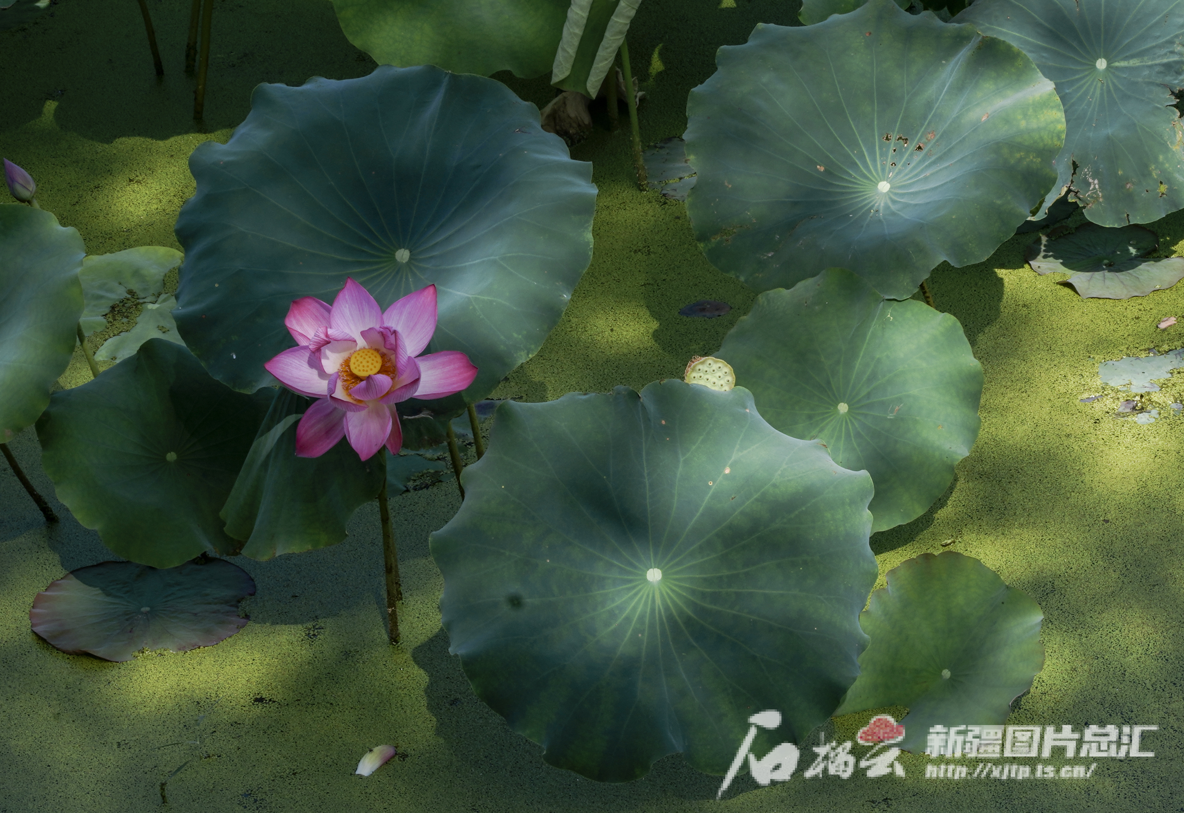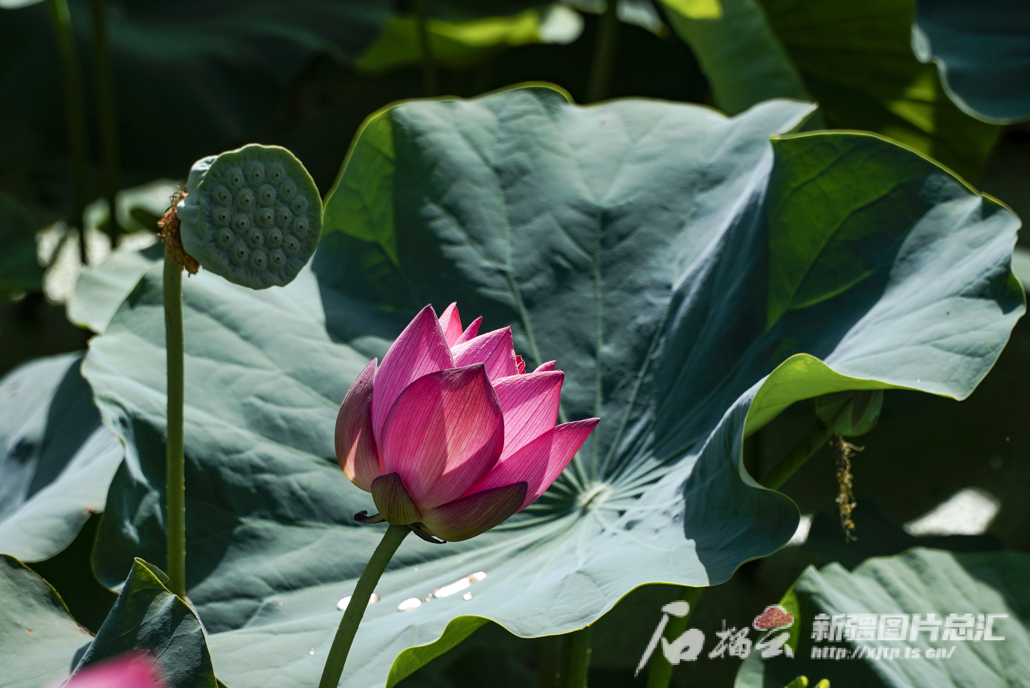 一朵荷花在莲蓬旁悄然盛开。