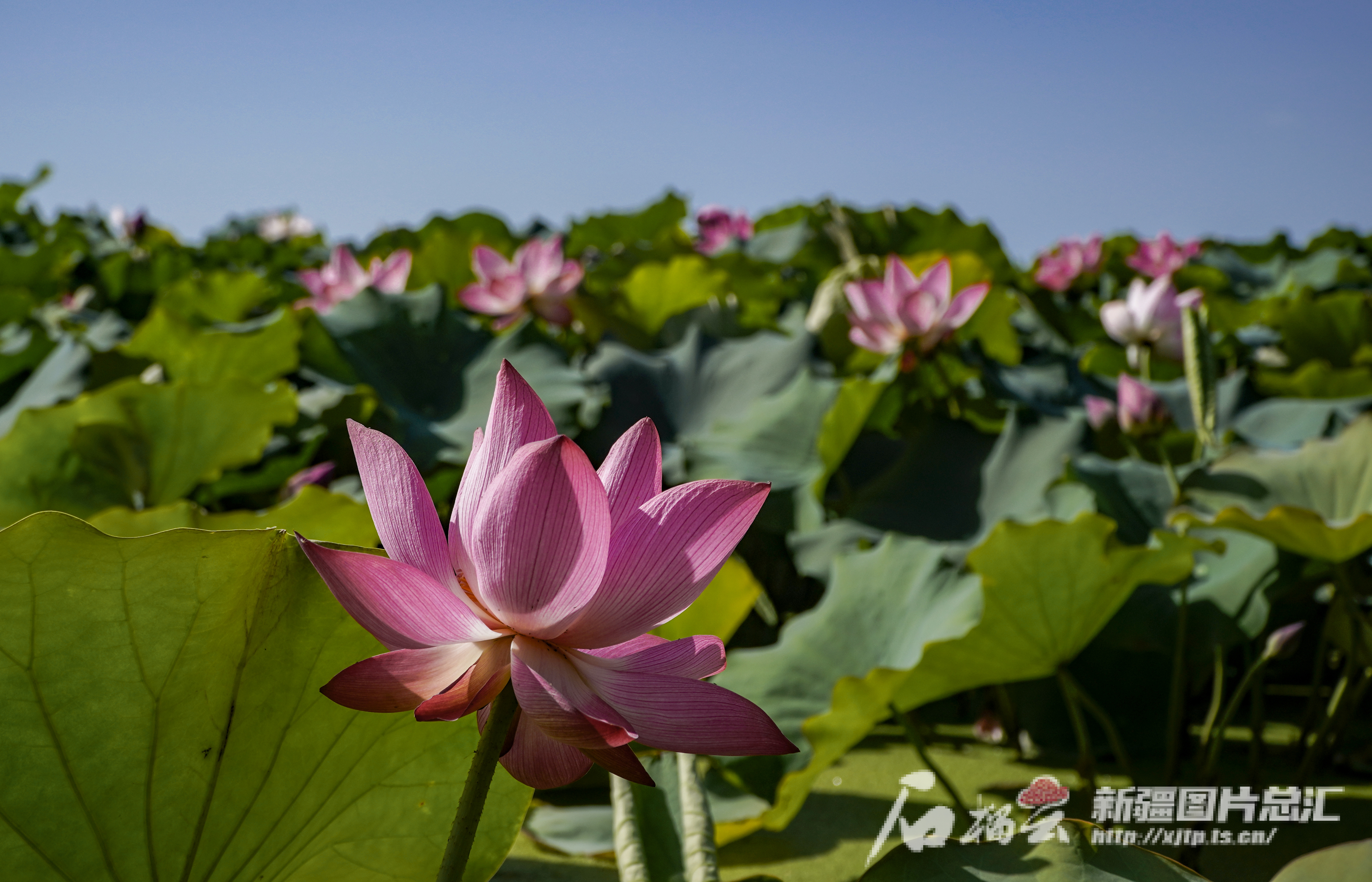 粉色的荷花大面积绽放。