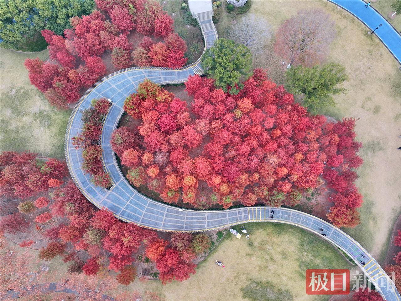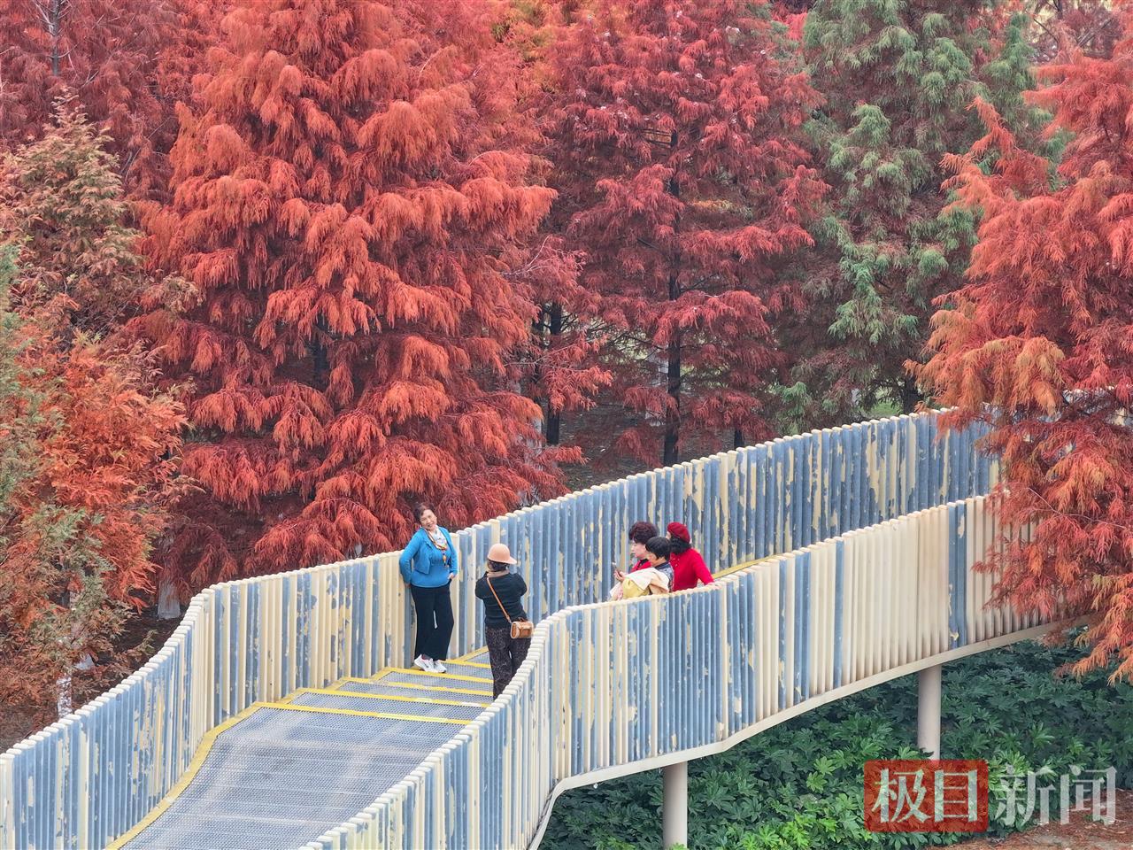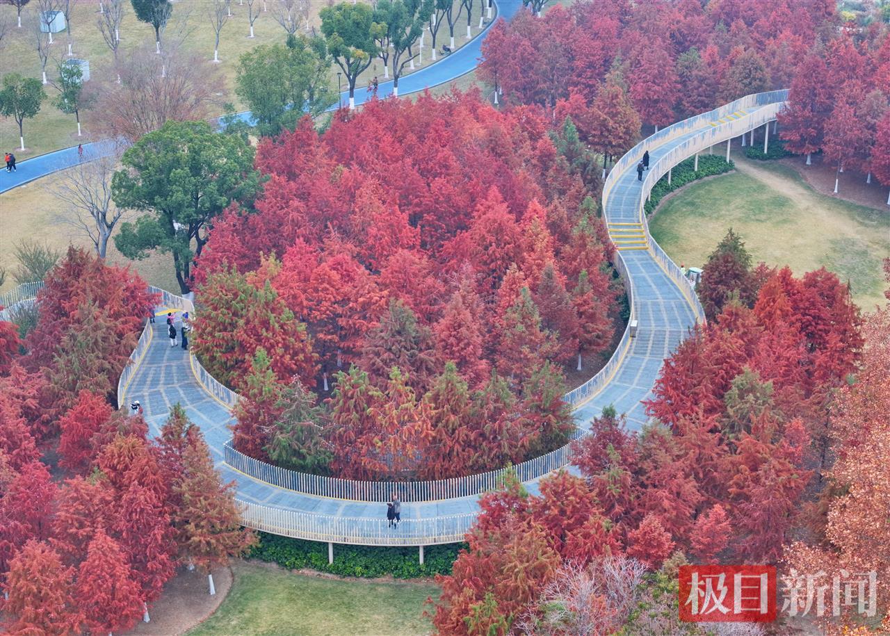 12月10日,武汉市江汉区常青人才公园内呈现一派色彩斑斓的冬日景象。环绕空中栈道种植的大片杉树染上锈红、橙黄的绚丽色彩,阳光透过枝叶洒下斑驳光影,氛围感十足。市民游客纷纷驻足观赏,仿佛置身于一幅立体的自然画卷中。