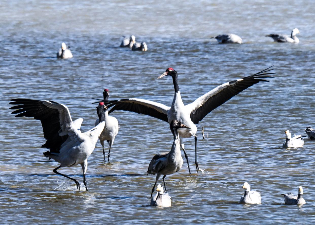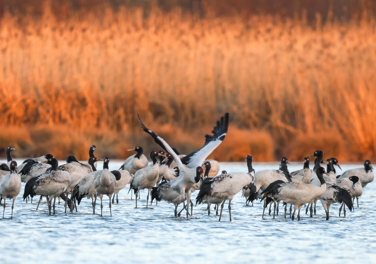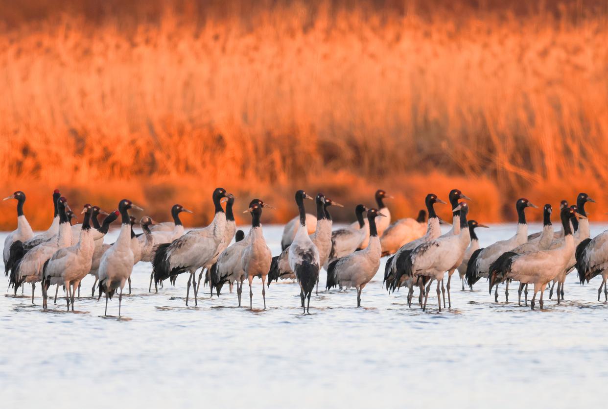 冬日,地处贵州省毕节市威宁县的草海国家级自然保护区呈现万鸟翔集的生态美景,黑颈鹤、灰鹤以及斑头雁等大批候鸟来此越冬。