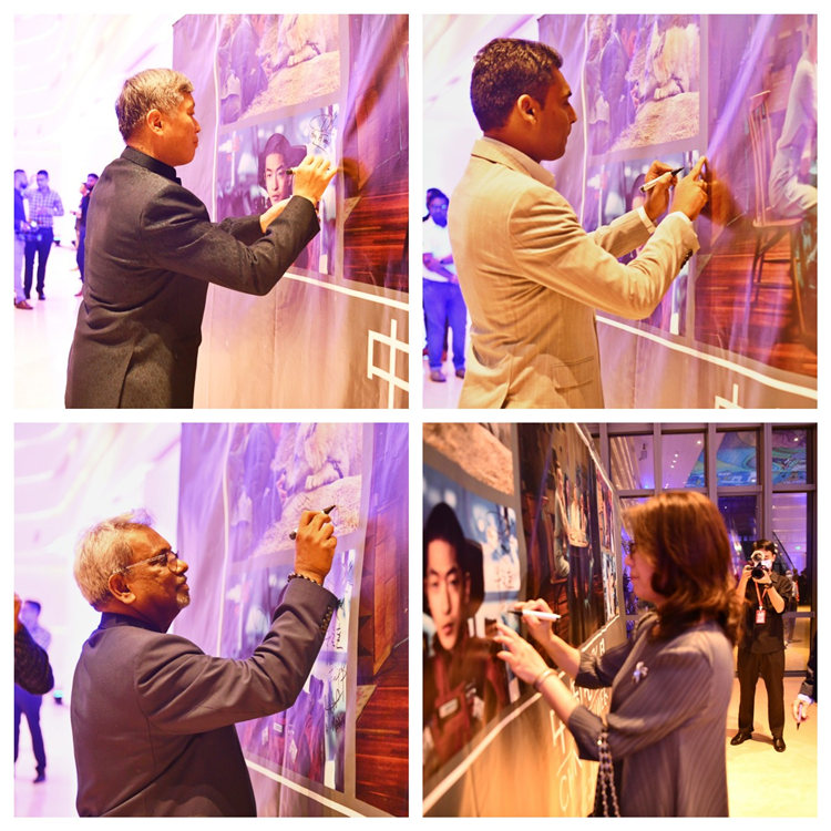 朱立英大使和蒂卢克部长及嘉宾在电影周海报上签字。毛里求斯中国文化中心供图