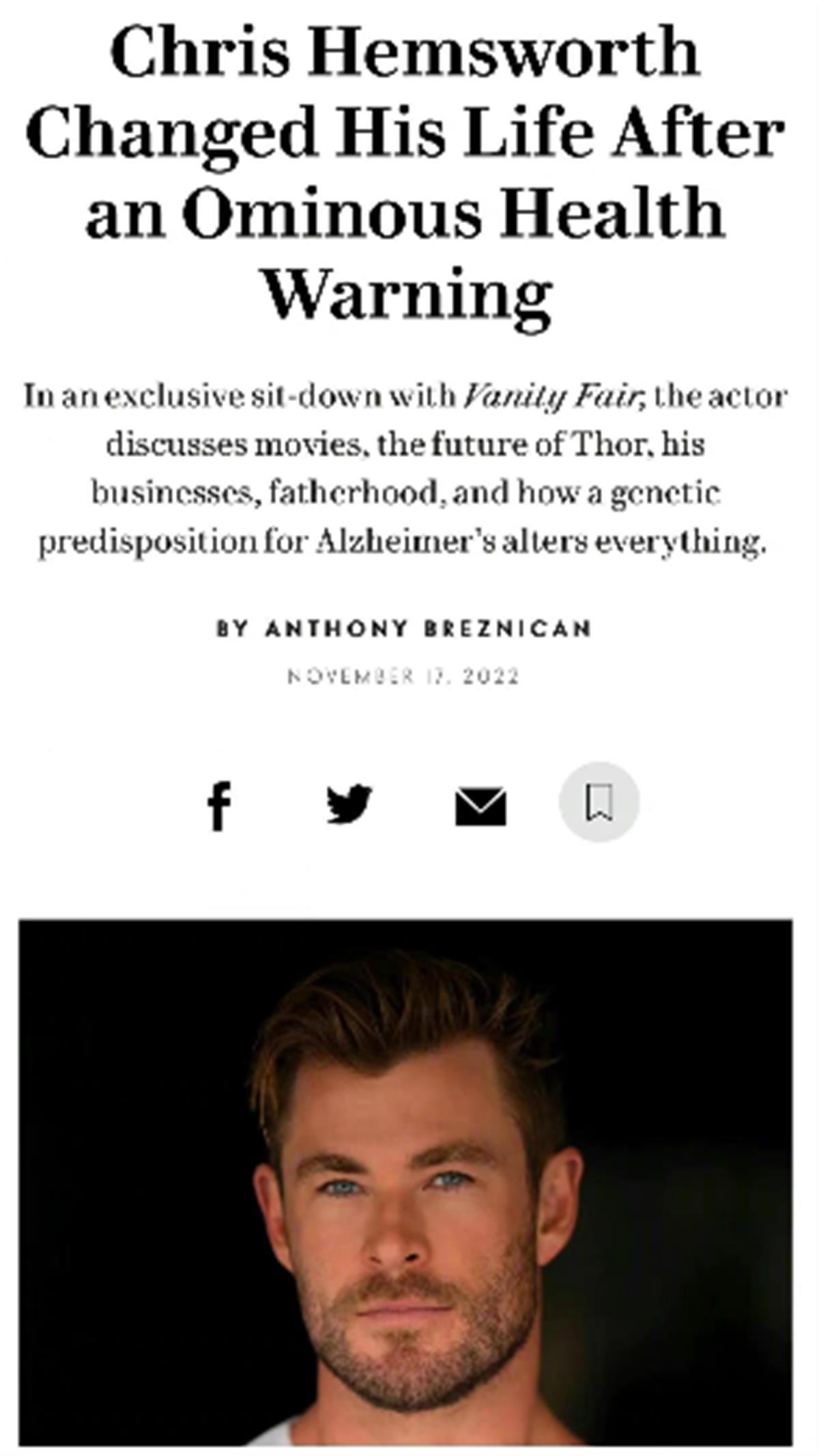 《名利场》报道介绍,美国国立卫生研究院2021年的一项研究显示,只有2%至3%的人会同时携带这两个拷贝。医生坦诚告知克里斯·海姆斯沃斯,他得阿尔茨海默症的可能性是常人的8-10倍。