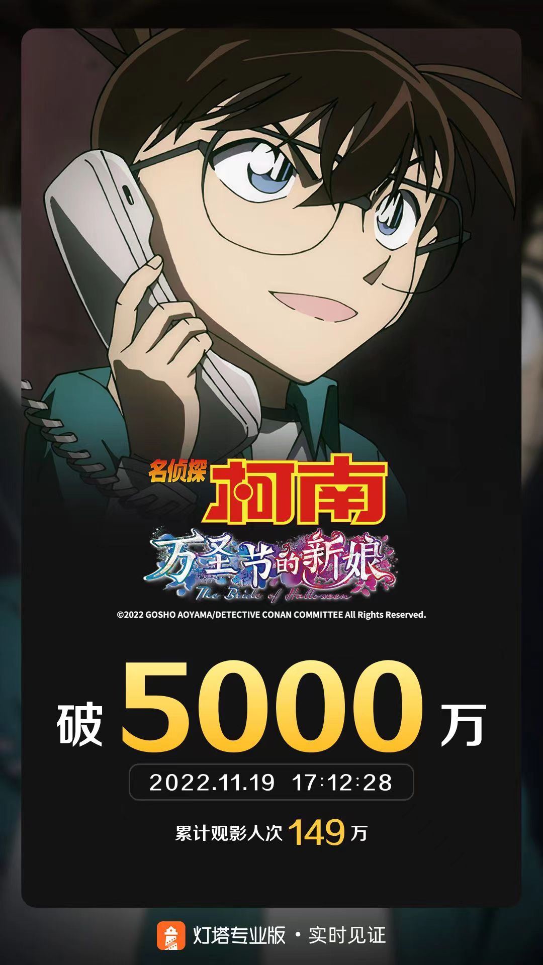 新京报讯(记者周慧晓婉)据灯塔专业版实时数据,截至11月19日17时12分,影片《名侦探柯南:万圣节的新娘》票房突破5000万。今日,影片发布上映版预告及海报。每一部柯南剧场版都有的经典开场白,在预告中惊喜呈现为本次剧场版的专属版本,超熟悉的音乐旋律加上工藤新一独白,瞬间唤醒热爱与初心,这一次柯南再度携手安室透,与宿敌炸弹客上演高能激燃的终极对决。