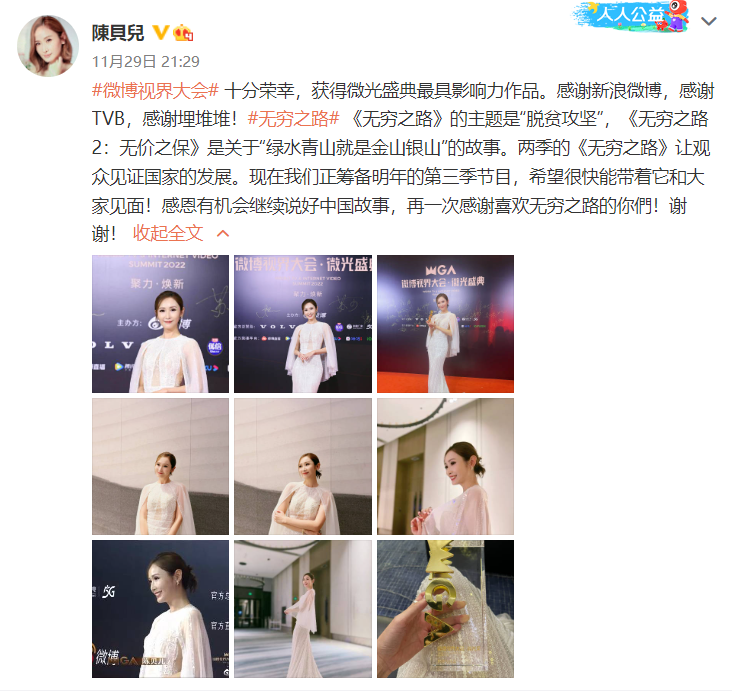 “《无穷之路》的主题是‘脱贫攻坚’,《无穷之路2:无价之保》是关于’绿水青山就是金山银山’的故事。两季的《无穷之路》让观众见证国家的发展。”当晚,陈贝儿在微博上的发文中这样说道。回顾这一路,这么多年她始终在做同一件事——以新闻工作者的视角讲好中国故事。她用镜头记录真实、传递故事,用双脚丈量每一寸土地,将故事传唱远方,用最好的作品回报伟大的时代。众所周知,拍摄纪录片往往需要经历环境给予的各种挑战。陈贝儿经历过高原反应、极寒气候、悬崖索道......每一步的崎岖,伴随着更深一寸的探索与看见。在这背后,是初心,也是坚持。