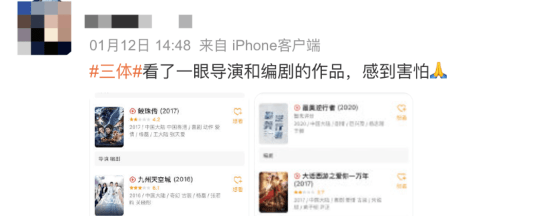 此外,也有不少书迷对剧版《三体》的制作团队表示担忧,有网友发现,该剧导演杨磊曾执导抗日题材电视剧《红色》受到好评,而后导演的作品《鲛珠传》、《逆袭之星途璀璨》却口碑较差,有书迷表示自己会“放低期待”。