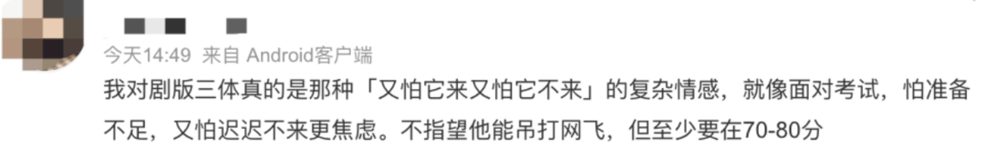 临近播出,有网友表示对剧版《三体》是一种“又怕它来又怕它不来”的复杂情感,担心播出后表现不佳,然而迟迟不来又只会更焦虑。