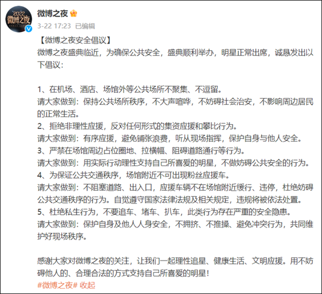 22日,微博之夜官方发博文倡议,要求粉丝不要在机场、酒店等公共场所聚集、逗留等扰乱公共秩序的地方。