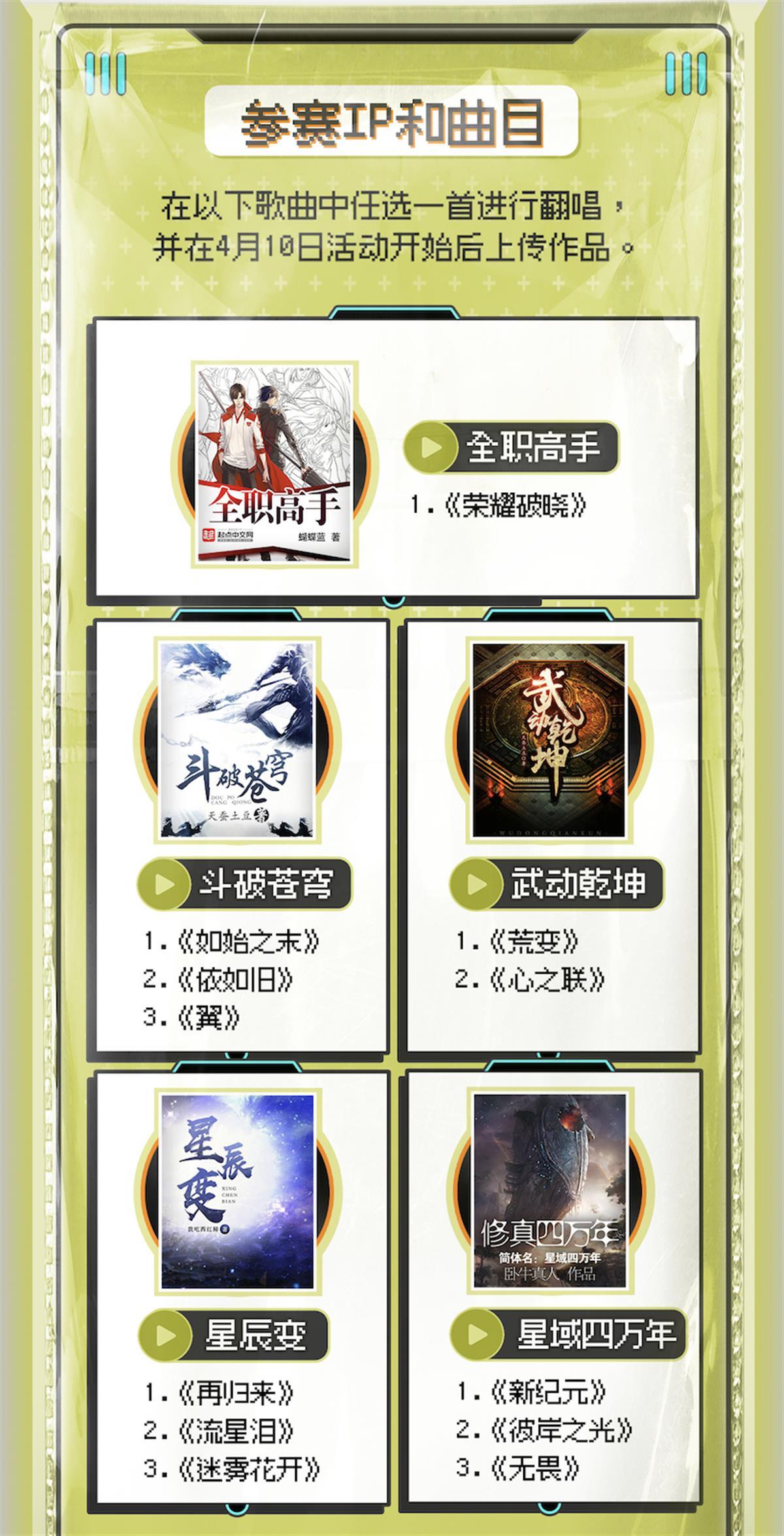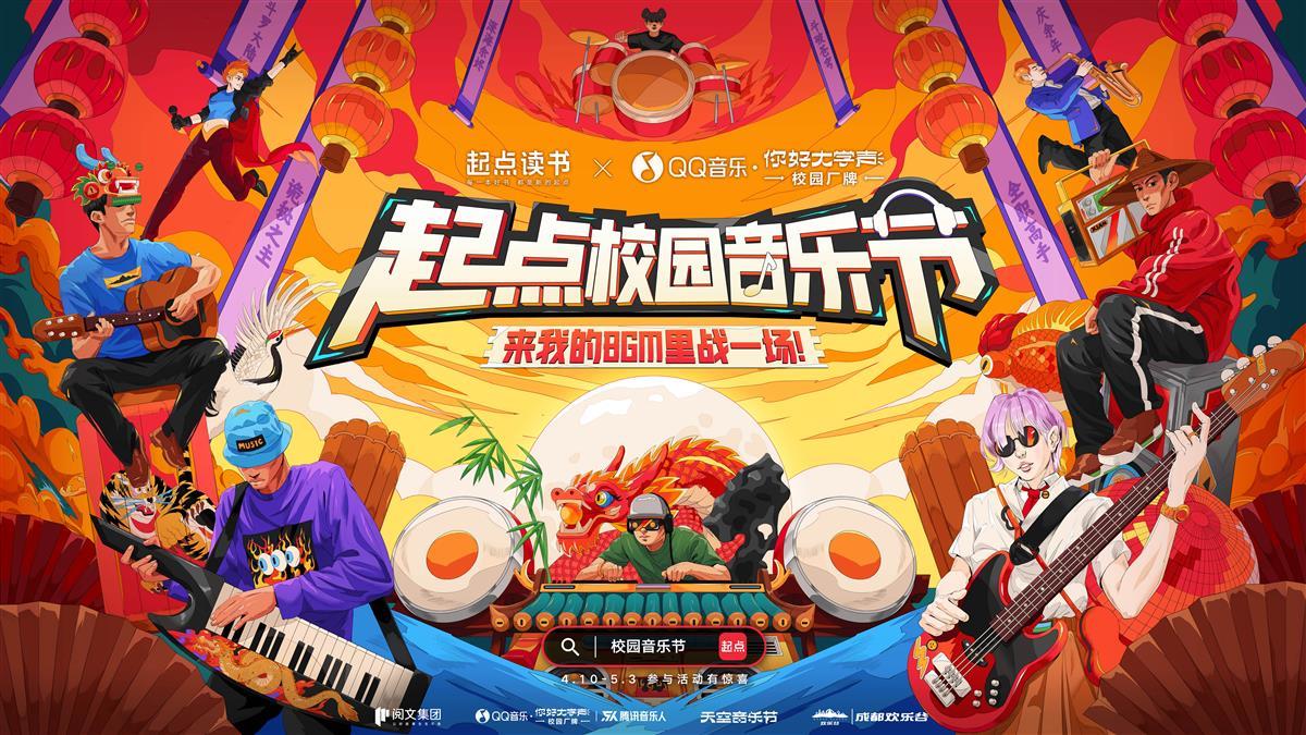 4月10日,阅文集团旗下起点读书App携手QQ音乐“你好,大学声”校园厂牌打造的“起点校园音乐节”全国校园海选活动正式启动,与其他音乐节有所不同,此次音乐节首次以网文IP为主题, 面向全国高校在校生开放《全职高手》《斗破苍穹》《星辰变》《星域四万年》《武动乾坤》等头部IP的12首歌曲翻唱权,并由王铮亮、INTO1刘彰和GALI等知名音乐人组成明星评委团,参与海选并最终获胜的校园音乐人,可以在网络文学和音乐结合的高燃舞台上放飞青春梦想。