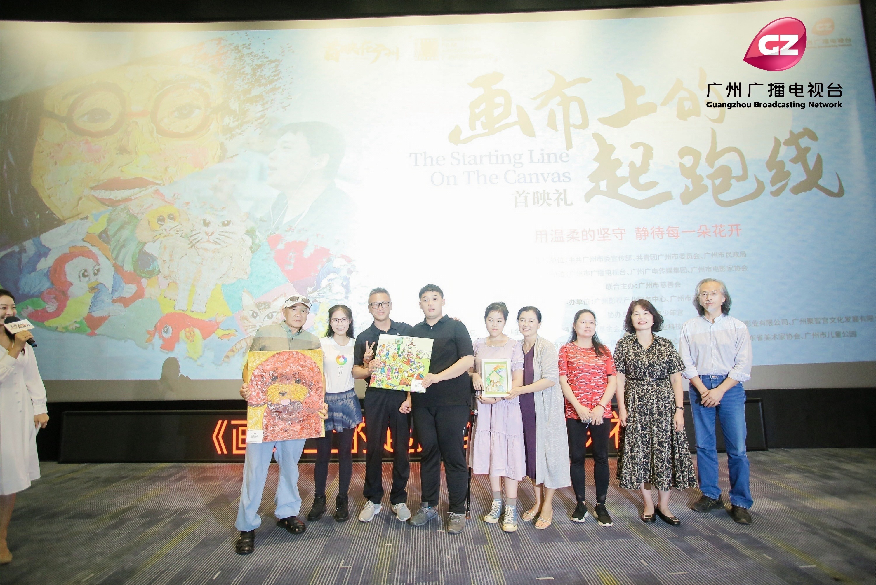 现场,《画布上的起跑线》导演向一民,制片人、广州市广播电视台影视频道总监徐斌,广州市少年宫老师关小蕾,连同卓君、一哲、乐桐等主创上台分享。向一民表示,这次他通过一部温暖人心的电影,记录了广州的点点滴滴,也完成了对融合教育的认知。徐斌表示,身为这部片子的制片人,感受很特别,因为拍摄这部作品认识了很多有着美好心灵的人,也认识了一群天使般的孩子。关小蕾表示,希望这部电影能让大家了解这些孩子的可爱之处,在同一片蓝天下彼此相爱。随后,一哲、卓君、乐桐将画作赠予徐斌、向一民及关小蕾,以自己的方式表达对他们的感谢。