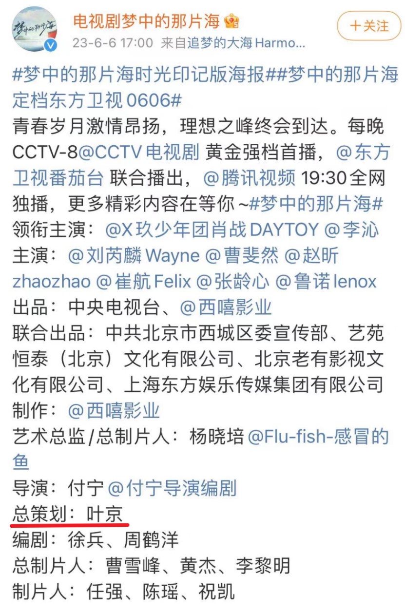 剧集片头虽未注明叶京为总策划,官博倒每次都有提到叶京