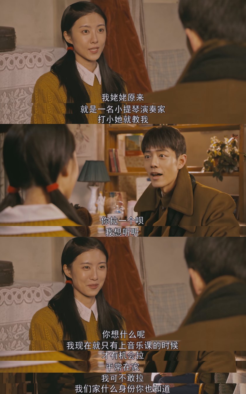 另外一个胡同女孩贺红玲(曹斐然饰),她是肖春生一开始心仪的人。贺红玲也有非常坎坷的成长经历,她来自音乐世家,但长辈们在动荡岁月中打成“走资派”,哪怕贺红玲有突出的音乐天赋,也只能隐藏起来。她平时在家连小提琴都不敢拉,“我们家什么身份你也知道,这万一把革委会的人给招来,说我们又想资产阶级复辟,到时候我妈又有的受了”。