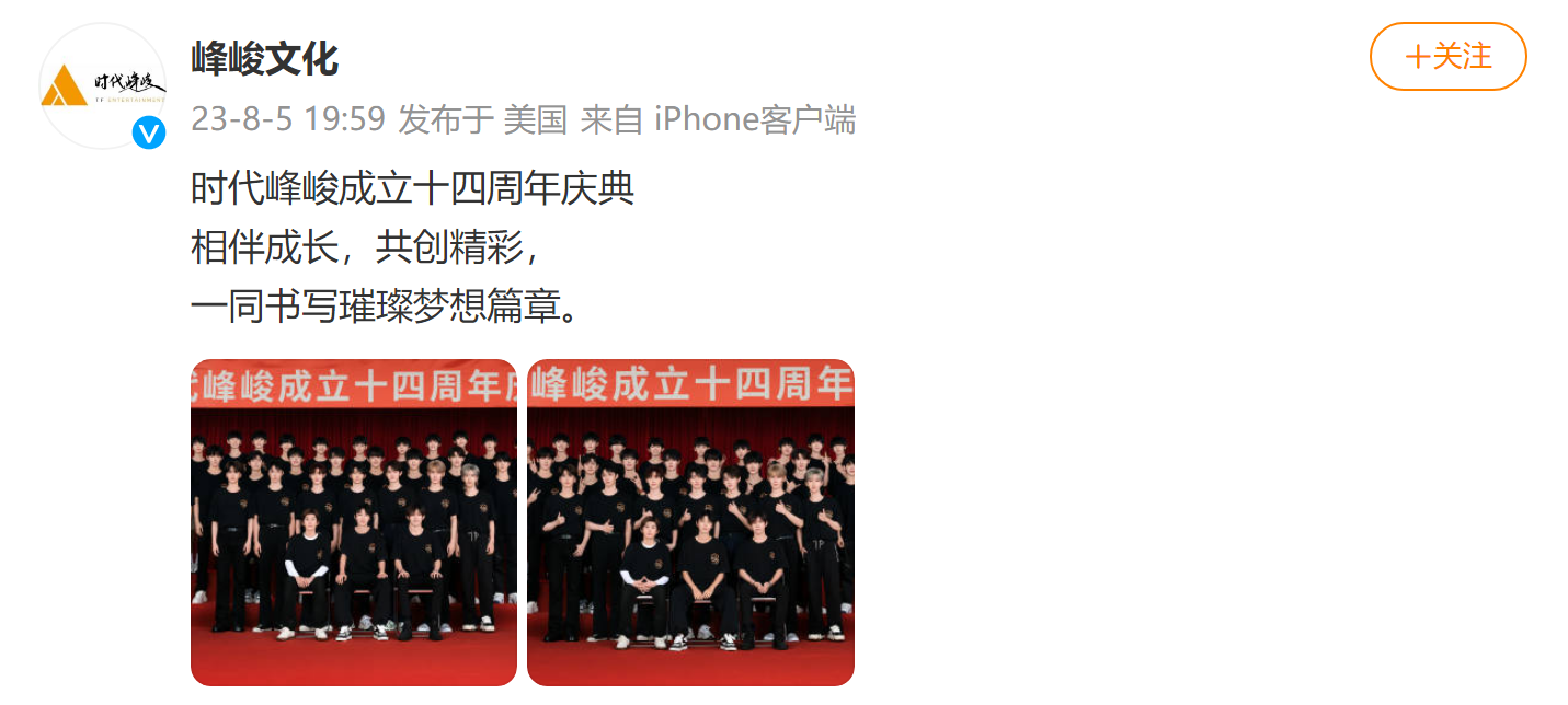 8月5日晚,“峰峻文化”官方微博晒出时代峰峻四代同框合照,TFBOYS坐前排C位,微博配文:时代峰峻成立十四周年庆典,相伴成长,共创精彩,一同书写璀璨梦想篇章。