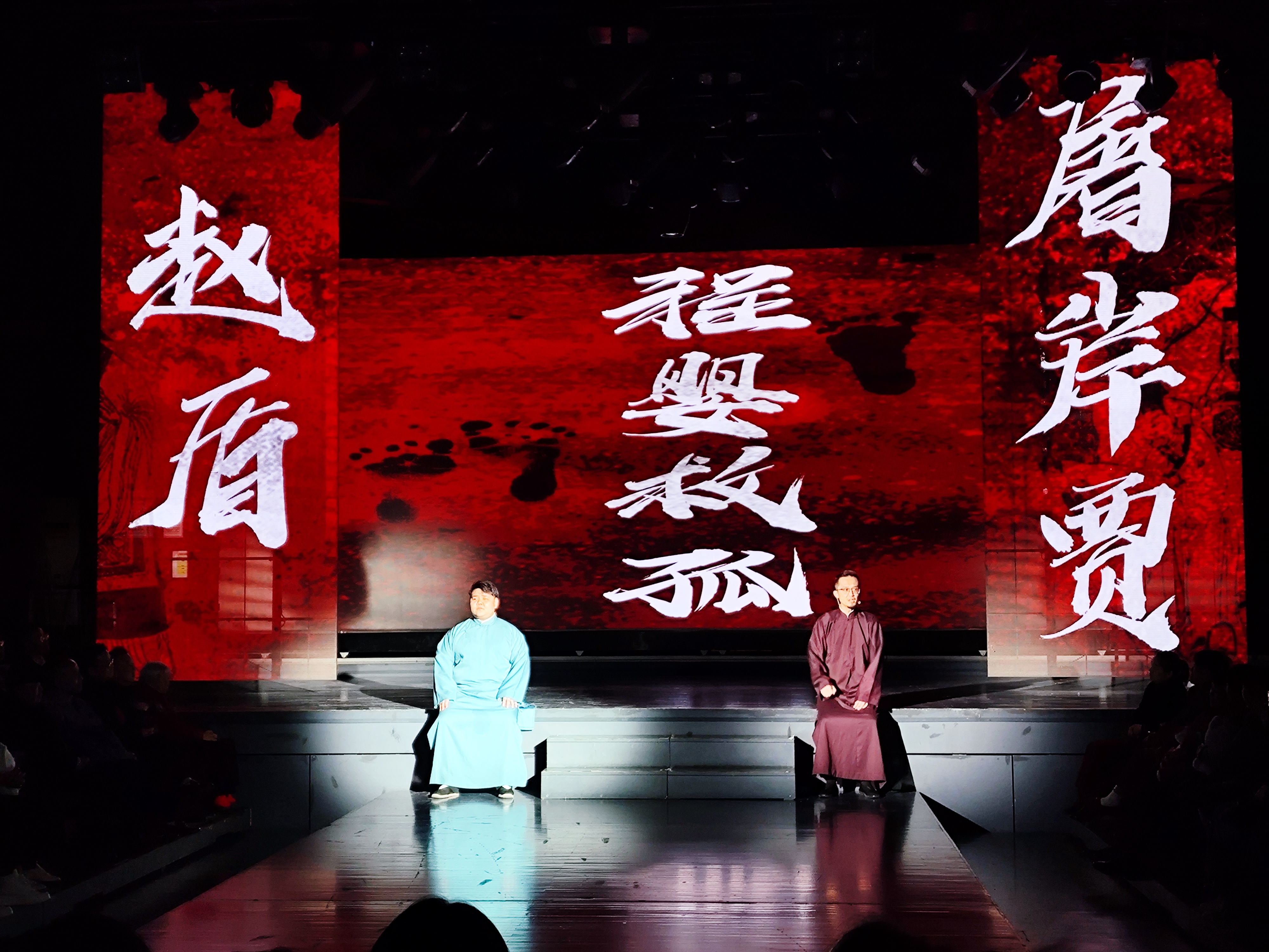 剧场短暂的黑暗后,大戏启幕,但是那一束明晃晃的灯光照亮的却是观众席的两位普通观众,他们聊起赵氏孤儿的故事,聊起即将上演的《程婴救孤》的主演们,说出他们的好奇与疑问。